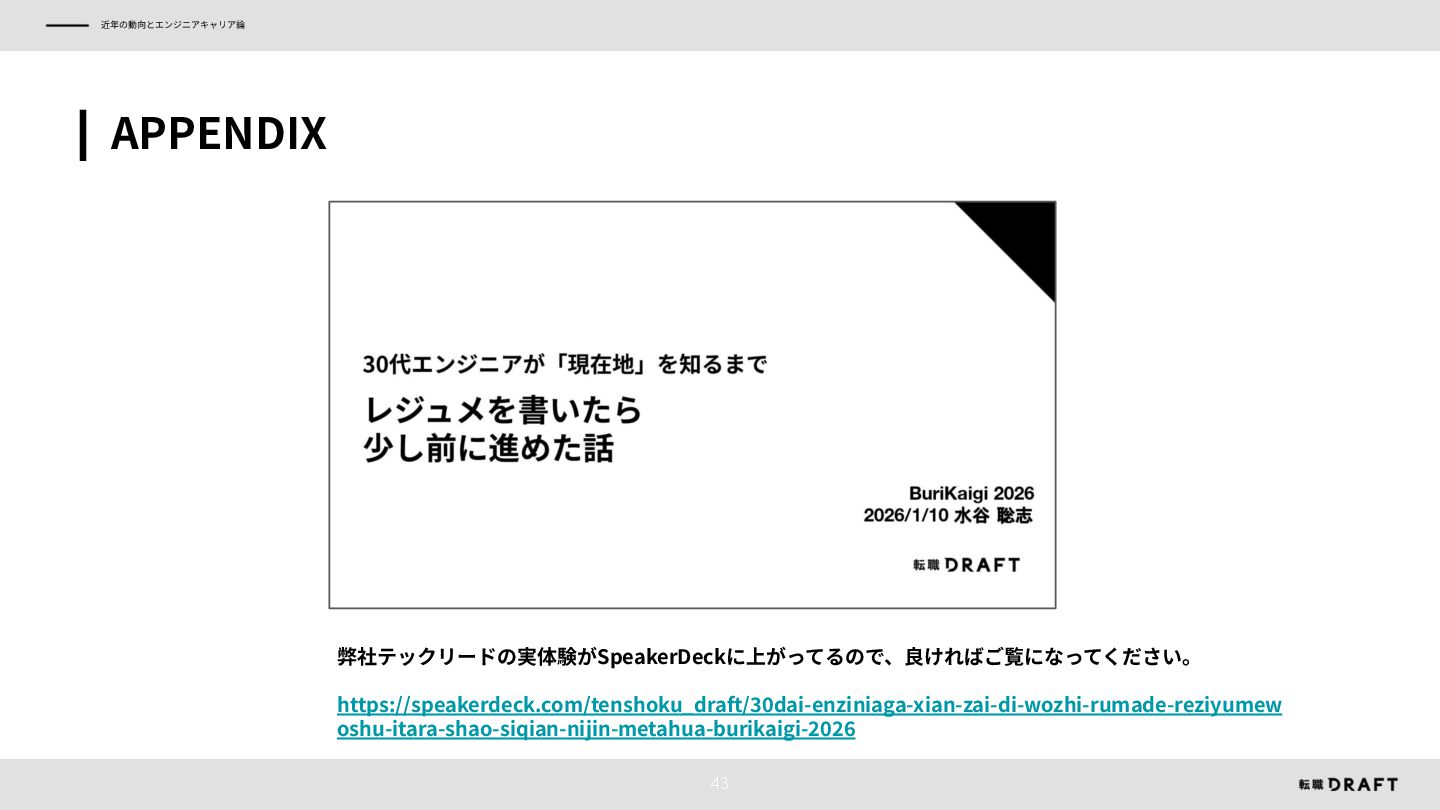 APPENDIX 43 弊社テックリードの実体験がSpeakerDeckに上がってるので、良ければご覧になってください。 https://speakerdeck.com/tenshoku_draft/30dai-enziniaga-xian-zai-di-wozhi-rumade-reziyumew oshu-itara-shao-siqian-nijin-metahua-burikaigi-2026 近年の動向とエンジニアキャリア論