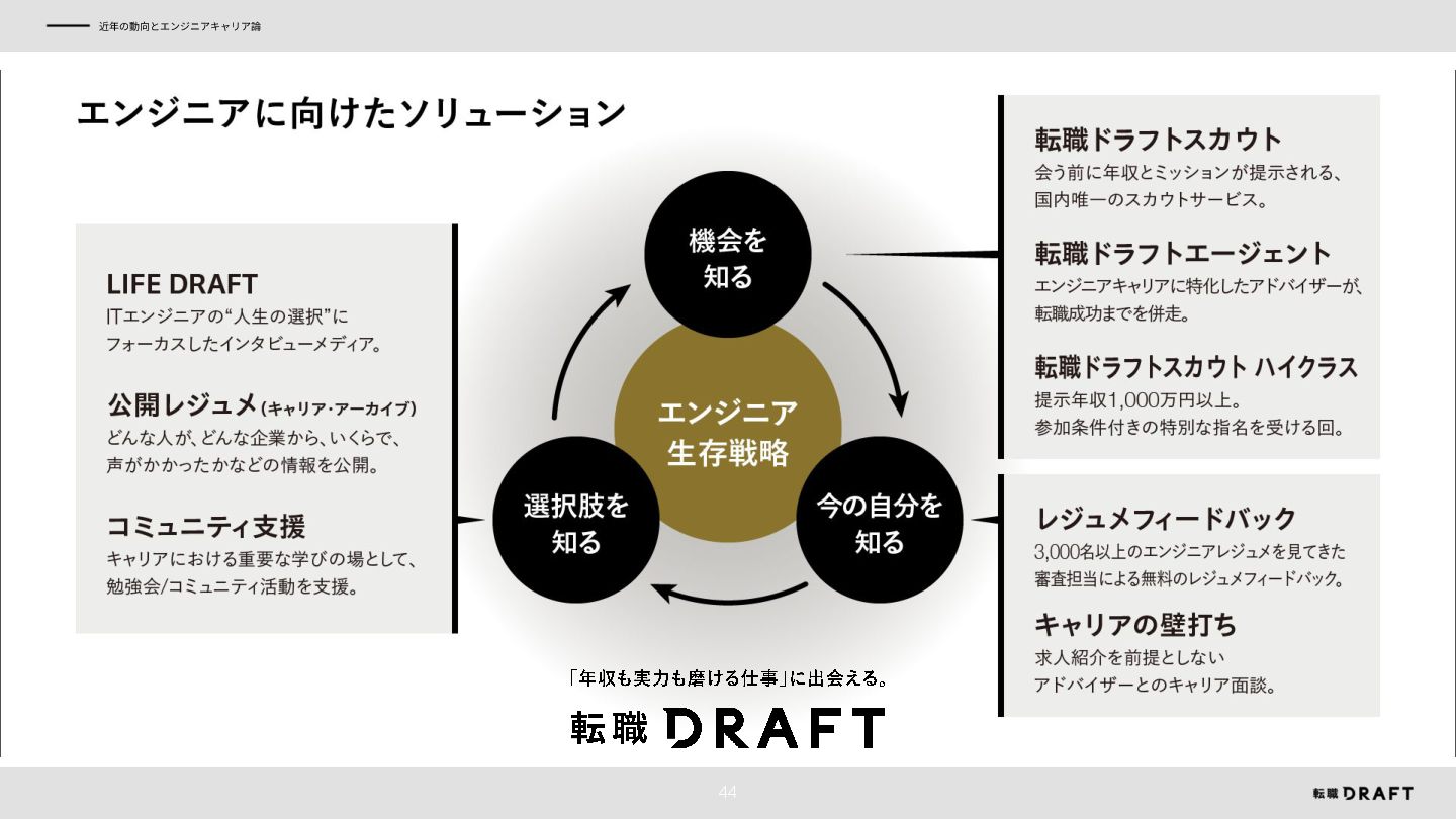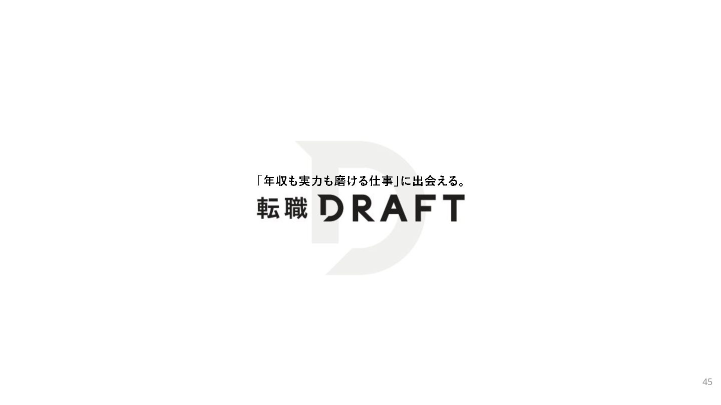 44 転職ドラフトの提供するアクティビティ キャリアにおける重要な学びの場として、勉 強会/コミュニティ活動を支援。 会う前に年収とミッションが提示される、国内唯 一のスカウトサービス。 ITエンジニアの“選択”にフォーカスしたイン タビューメディア。 どんな人が、どんな企業から、いくらで、声が かかったかの情報を公開。