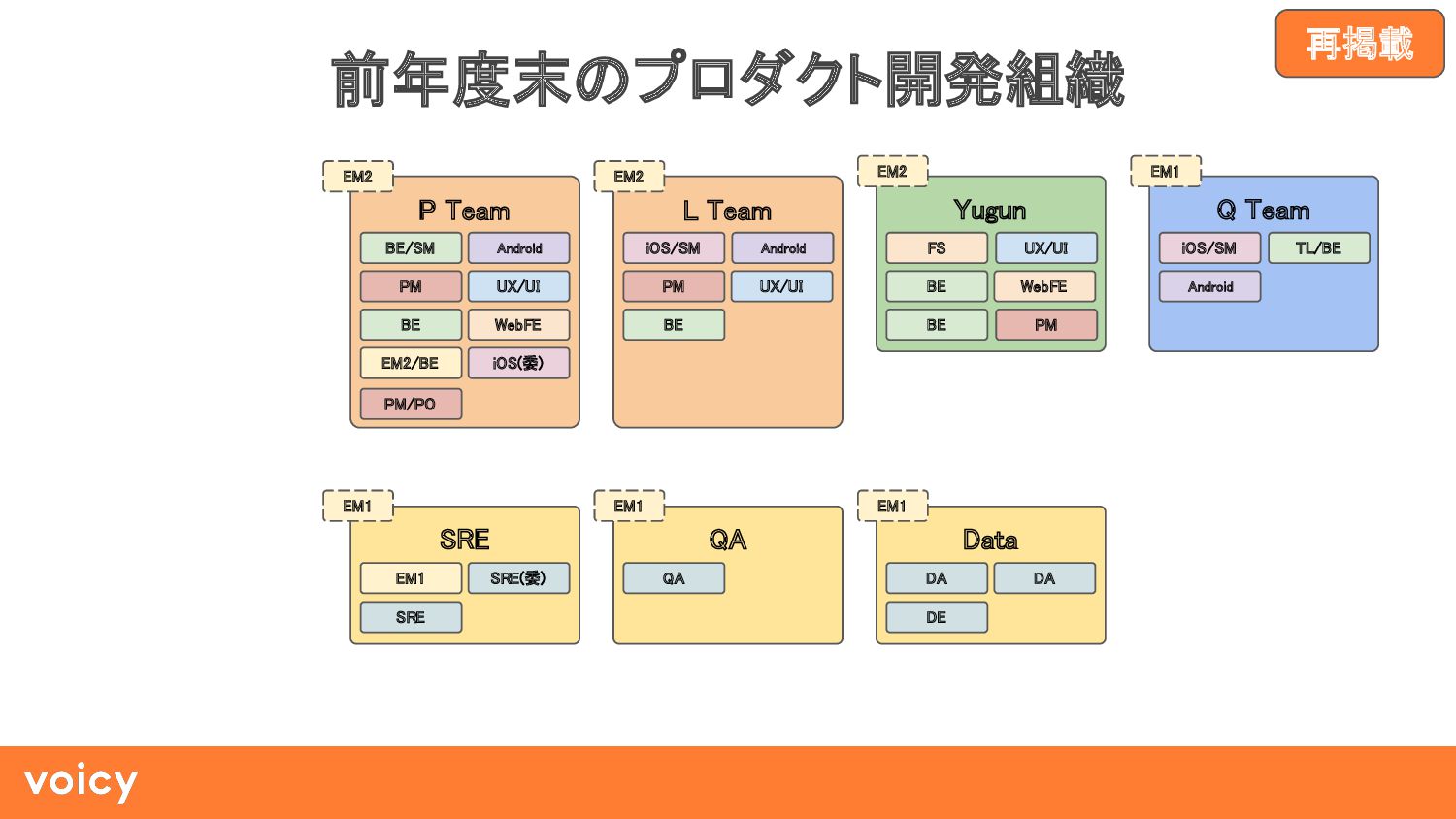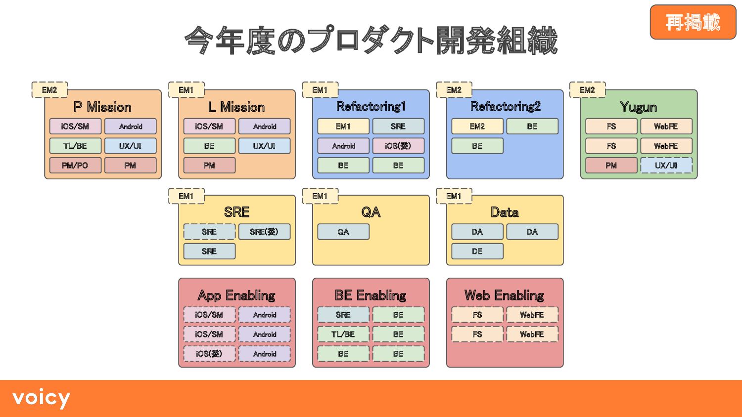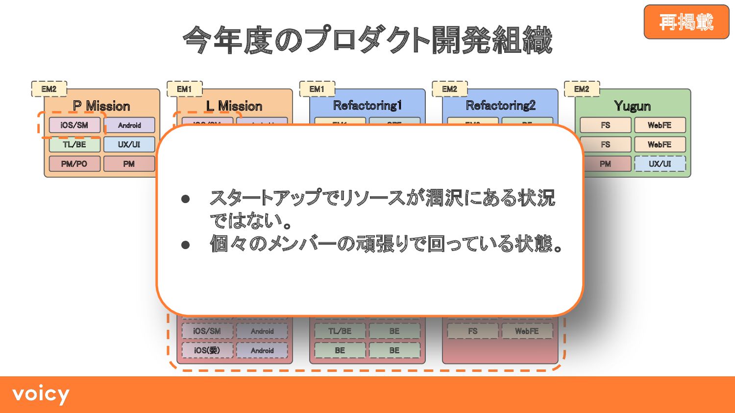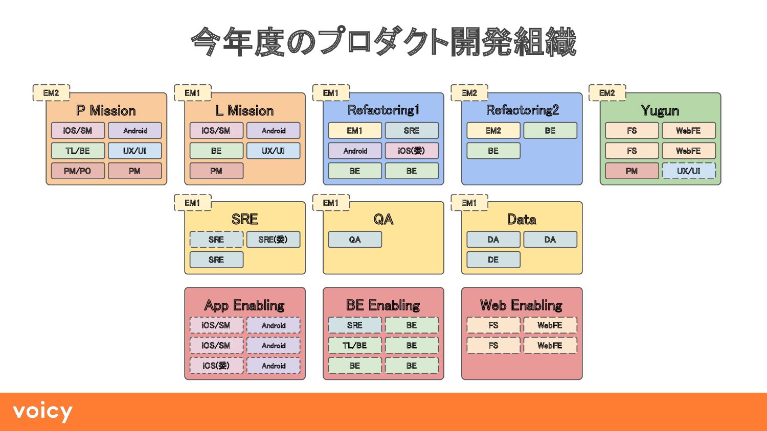 Mission BE iOS/SM Android UX/UI PM Refactoring1 Android EM1 SRE iOS(委) BE BE Refactoring2 BE EM2 BE Yugun FS FS WebFE WebFE PM UX/UI Data DE DA DA SRE SRE SRE SRE(委) QA QA App Enabling iOS/SM Android iOS/SM iOS(委) Android Android BE Enabling SRE BE TL/BE BE BE BE Web Enabling FS WebFE FS WebFE EM2 EM2 EM2 EM1 EM1 EM1 EM1 EM1 再掲載 • スタートアップでリソースが潤沢にある状況 ではない。 • 個々のメンバーの頑張りで回っている状態。