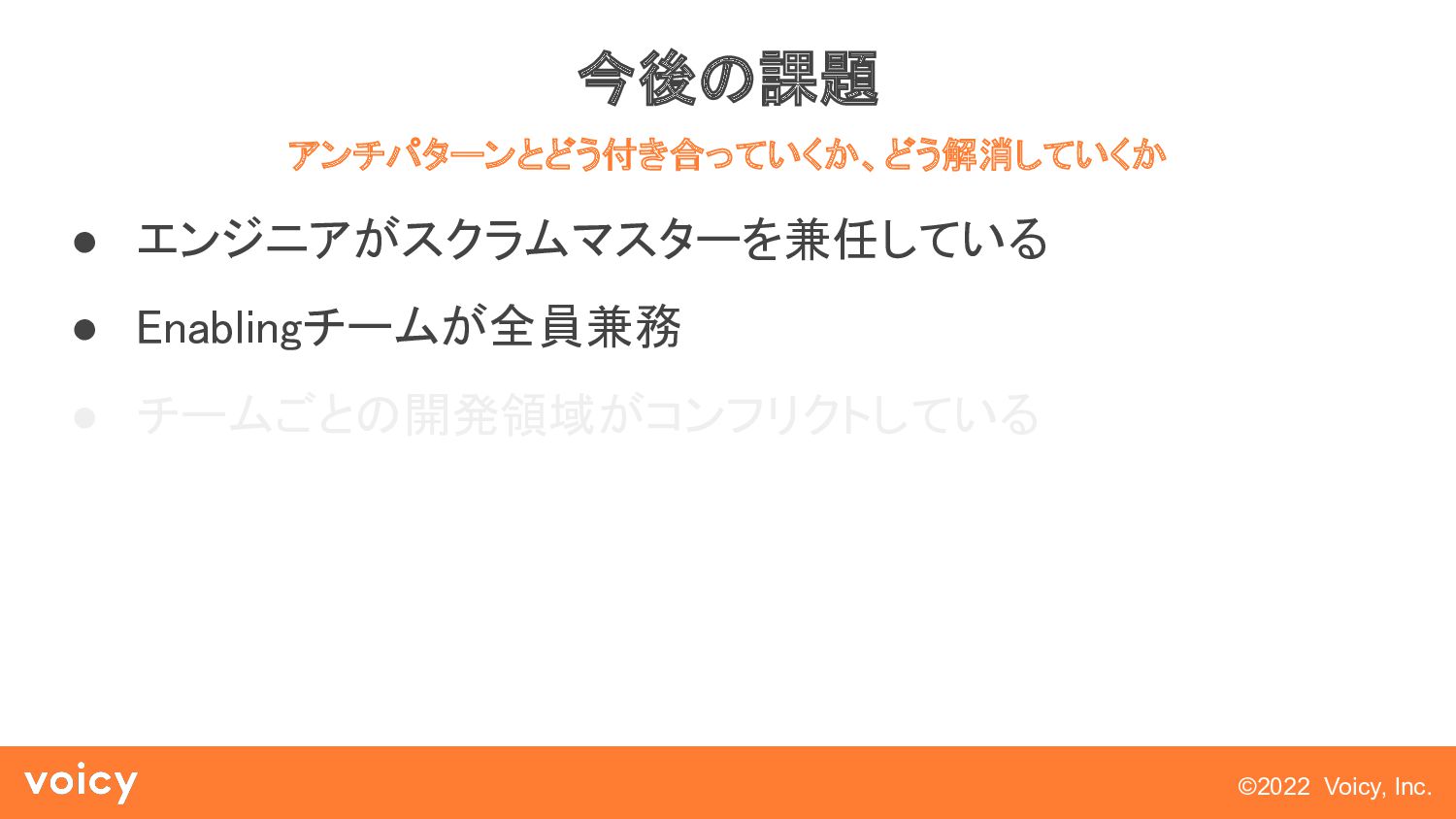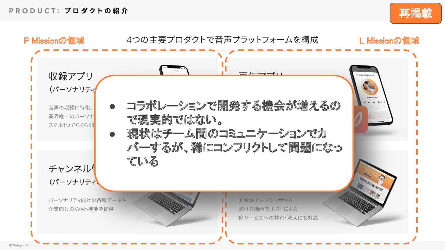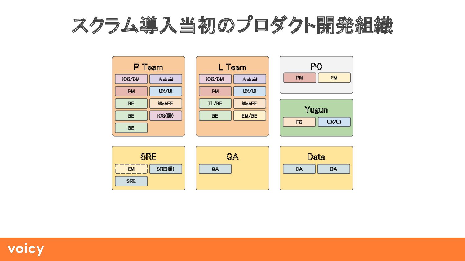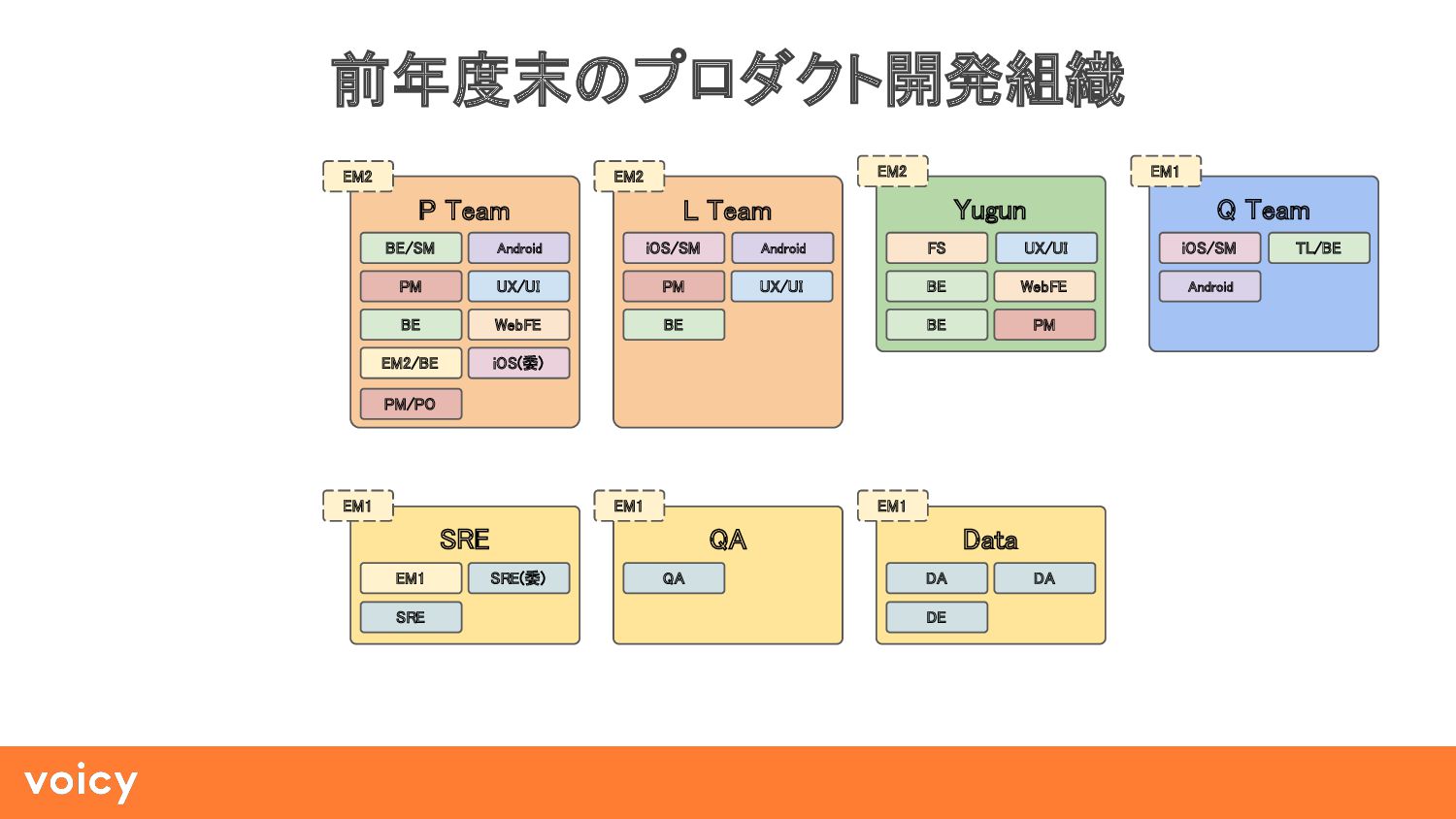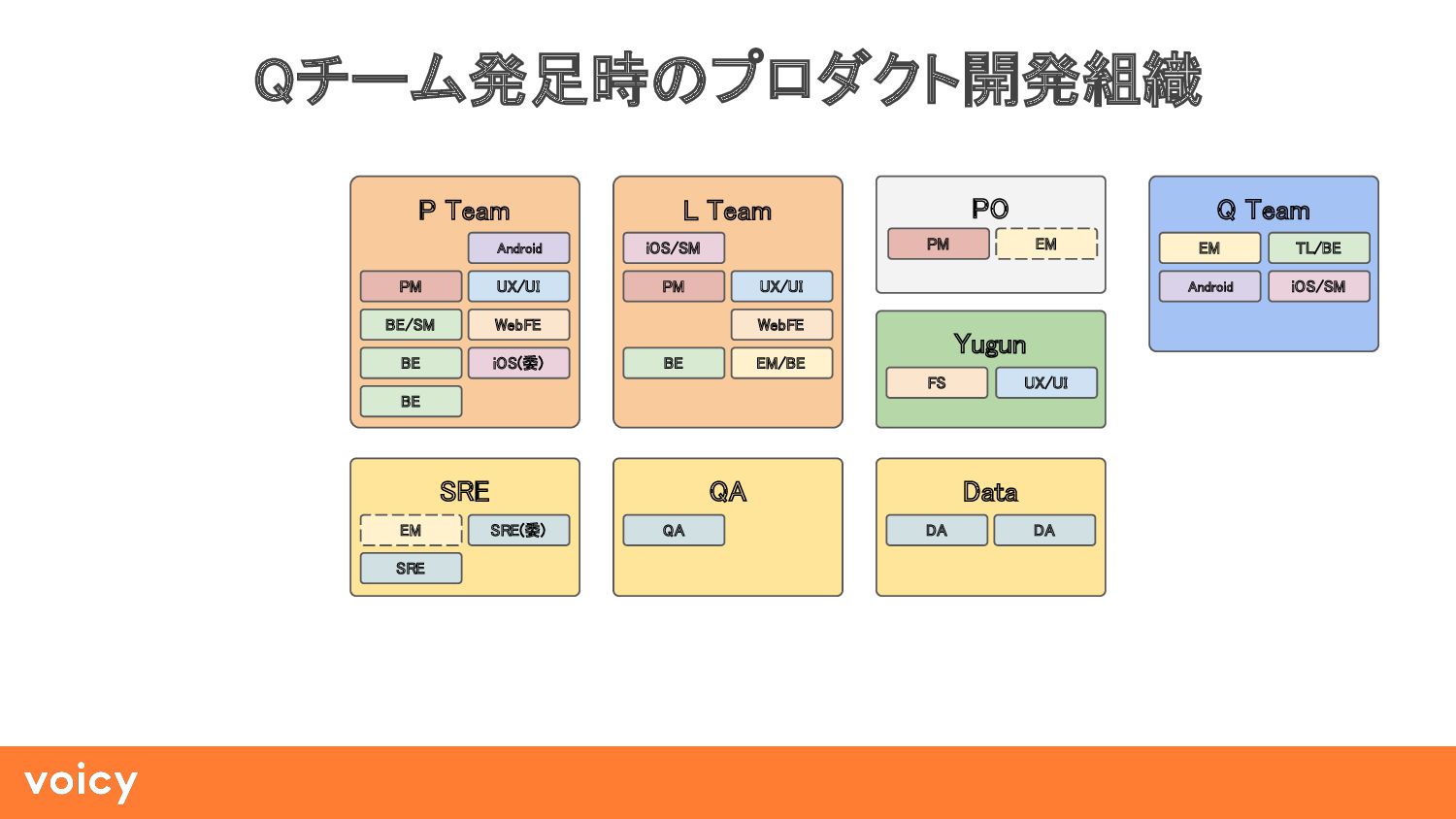 Mission BE iOS/SM Android UX/UI PM Refactoring1 Android EM1 SRE iOS(委) BE BE Refactoring2 BE EM2 BE Yugun FS FS WebFE WebFE PM UX/UI Data DE DA DA SRE SRE SRE SRE(委) QA QA App Enabling iOS/SM Android iOS/SM iOS(委) Android Android BE Enabling SRE BE TL/BE BE BE BE Web Enabling FS WebFE FS WebFE EM2 EM2 EM2 EM1 EM1 EM1 EM1 EM1 再掲載 • スタートアップでリソースが潤沢にある状況 ではない。 • 個々のメンバーの頑張りで回っている状態。