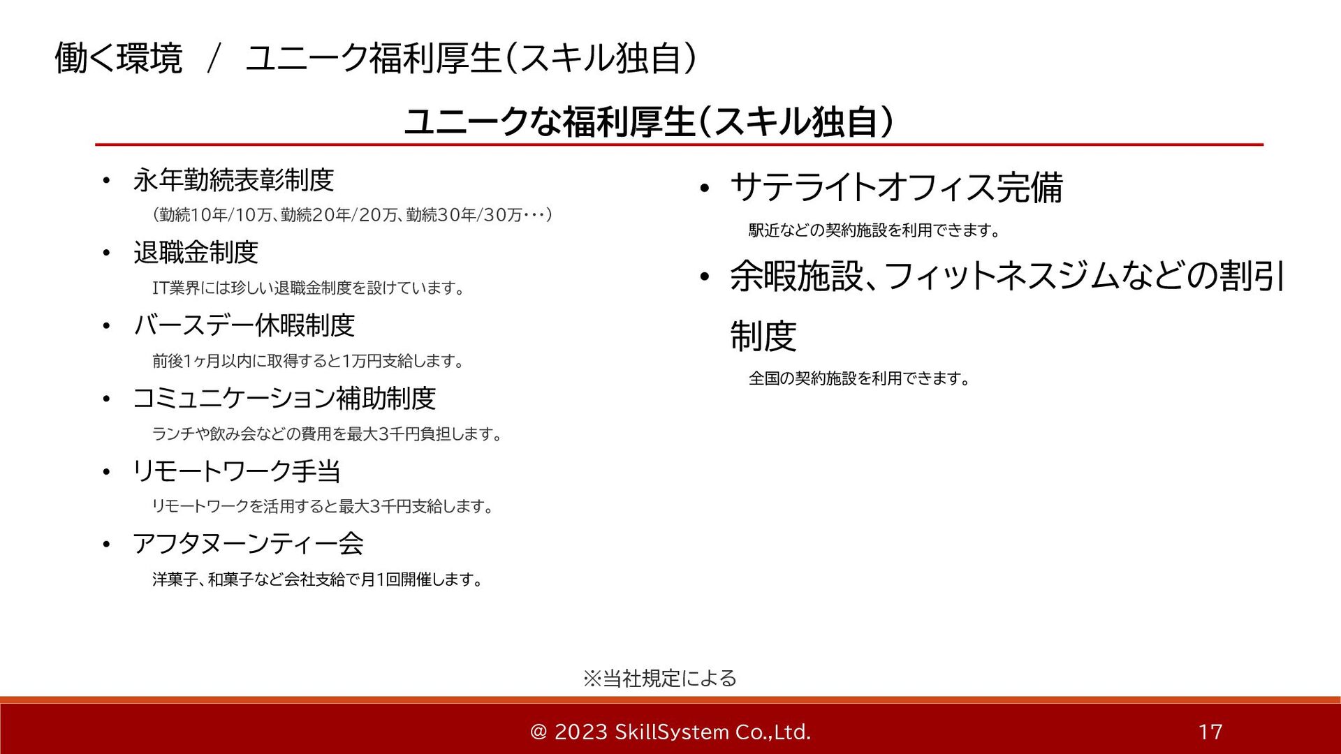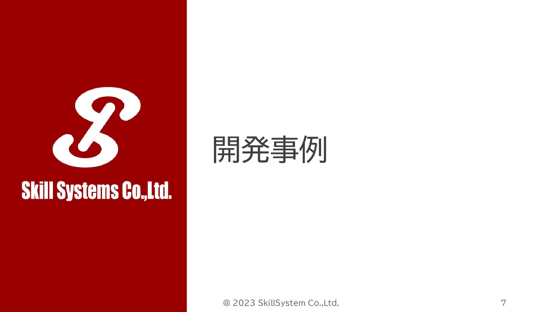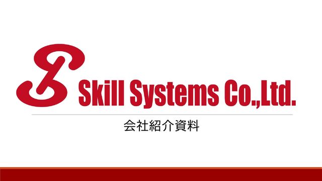 スキルシステムズ株式会社の会社紹介資料。 「会社概要」、「事業内容」、「開発事例」、「環境・カルチャー」、「選考」の5つで構成される。 スキルシステムズは新大阪を拠点に Webシステム開発をはじめとし、AI・IoTを用いた開発、 クラウドインフラ、サイバーセキュリティなどの提供を行っています。 お客様のニーズに沿った提案で事業の成長に貢献しています。