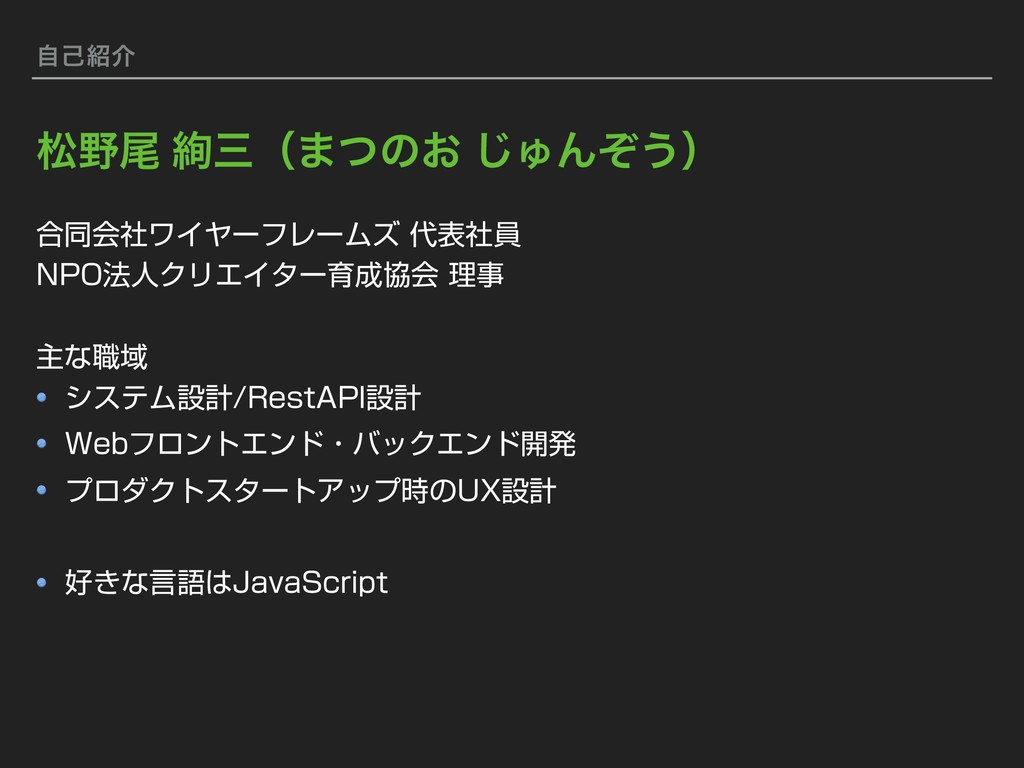 ࣗݾհ ߹ಉձࣾϫΠϠʔϑϨʔϜζදࣾһ /10๏ਓΫϦΤΠλʔҭڠձཧࣄ ओͳ৬Ҭ γεςϜઃܭ3FTU"1*ઃܭ 8FCϑϩϯτΤϯυɾόοΫΤϯυ։ൃ ϓϩμΫτελʔτΞοϓ࣌ͷ69ઃܭ ͖ͳݴޠ+BWB4DSJQU দඌ Ҁࡾʢ·ͭͷ͓