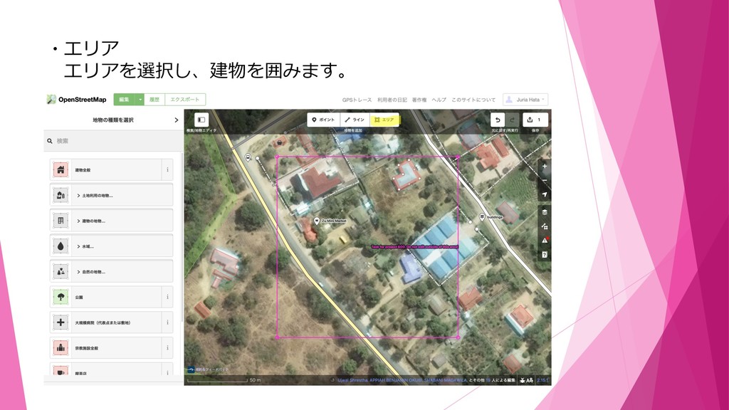 囲い終わったら必ず直交化をし、地図の種類を検索(この場 合は建物全般をクリック)して選択します。
