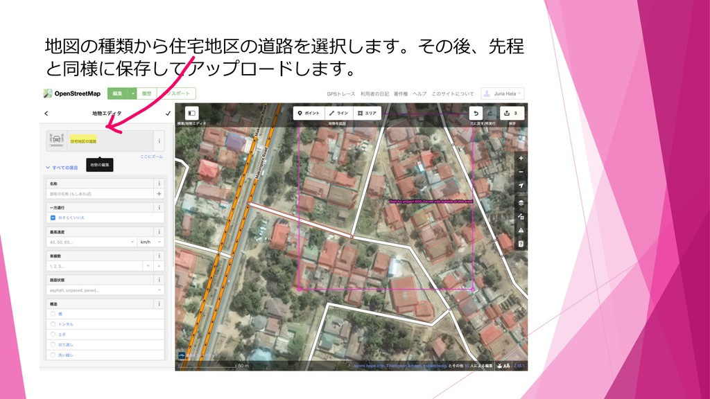 地図の種類から住宅地区の道路を選択します。その後、先程 と同様に保存してアップロードします。