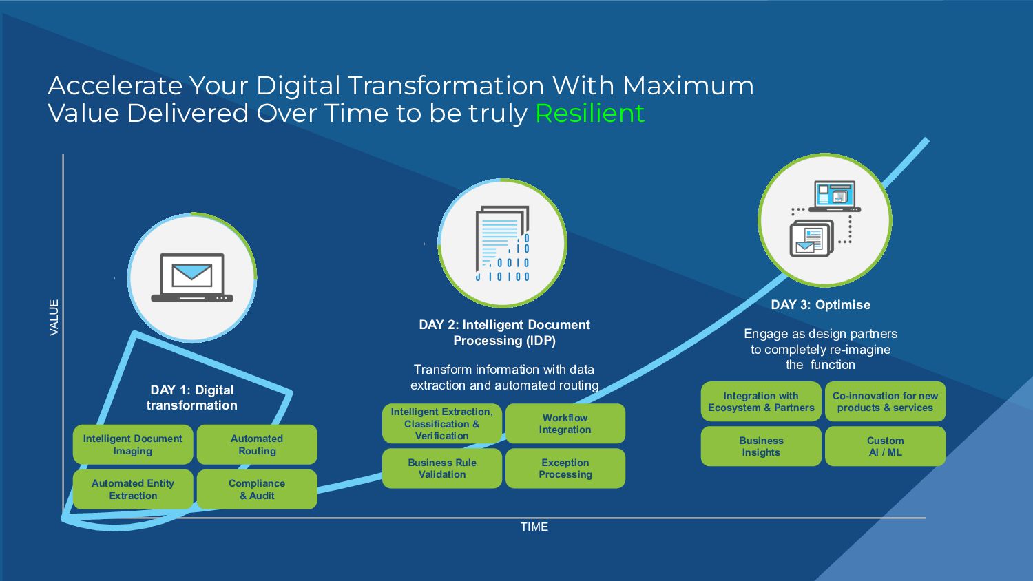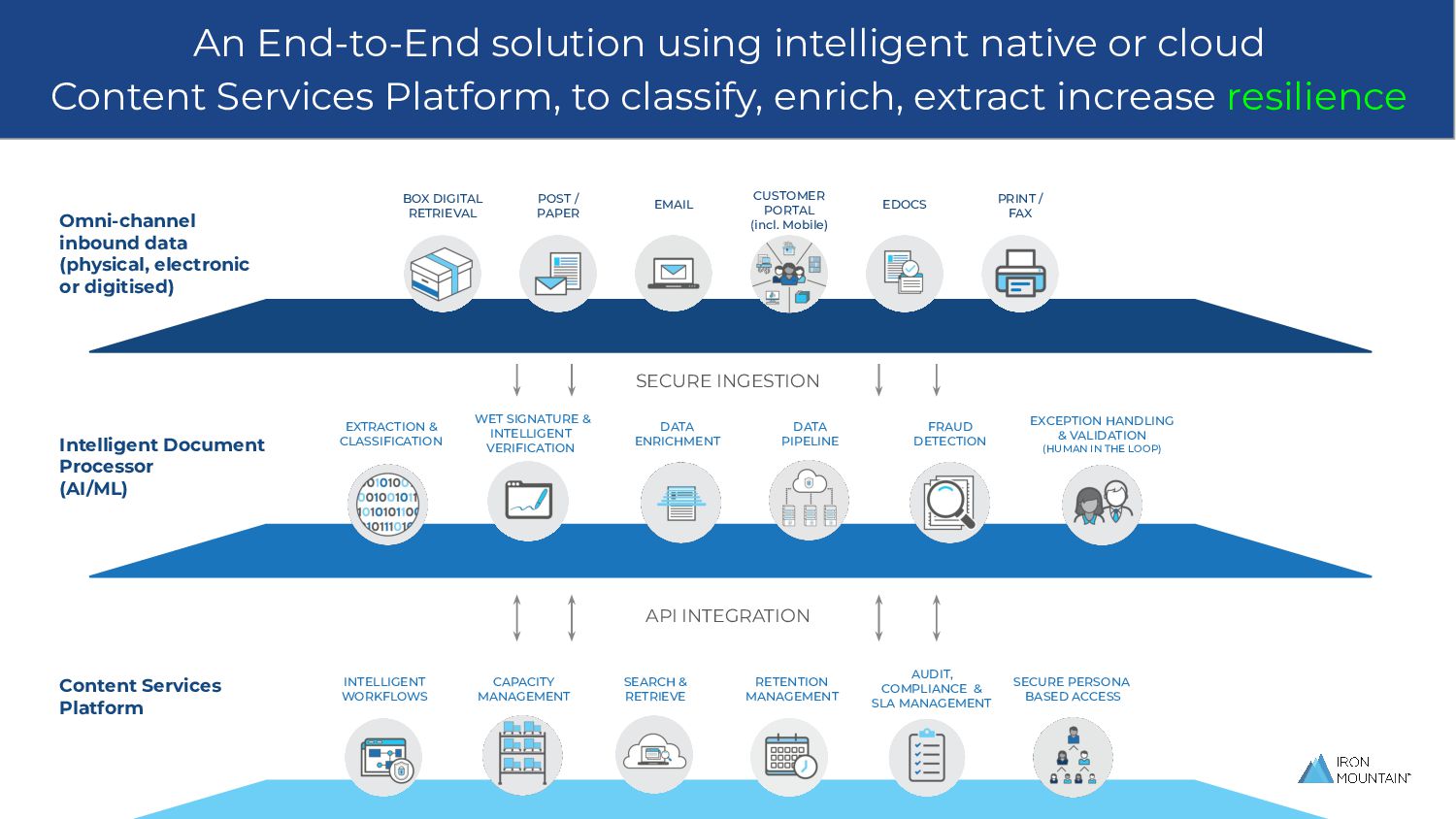 Platform, to classify, enrich, extract increase resilience Omni-channel inbound data (physical, electronic or digitised) CUSTOMER PORTAL (incl. Mobile) PRINT / FAX POST / PAPER EDOCS BOX DIGITAL RETRIEVAL EMAIL SECURE INGESTION RETENTION MANAGEMENT SECURE PERSONA BASED ACCESS CAPACITY MANAGEMENT AUDIT, COMPLIANCE & SLA MANAGEMENT INTELLIGENT WORKFLOWS SEARCH & RETRIEVE Content Services Platform DATA PIPELINE EXCEPTION HANDLING & VALIDATION (HUMAN IN THE LOOP) WET SIGNATURE & INTELLIGENT VERIFICATION FRAUD DETECTION EXTRACTION & CLASSIFICATION DATA ENRICHMENT Intelligent Document Processor (AI/ML) API INTEGRATION