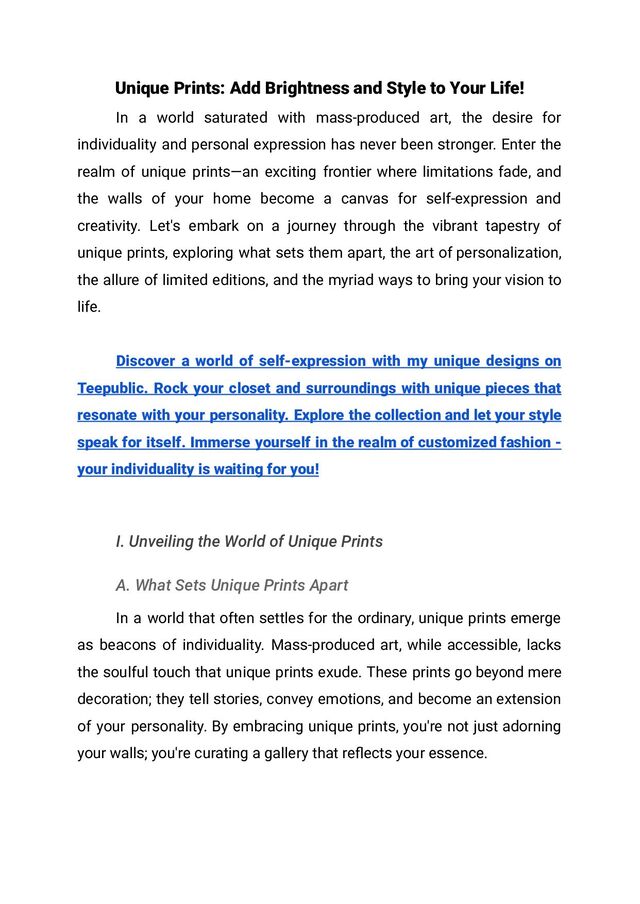 Next Masterpiece A. Exploring Emerging Artists and Trends Stay ahead of the curve by exploring the works of emerging artists in the unique prints scene. Uncover the stories behind the prints, connect with the artists, and be part of a community that celebrates creativity. Predict upcoming trends, and be the first to adorn your walls with the masterpieces of tomorrow. B. Connecting with the Community The journey of art is more fulfilling when shared. Engage with fellow art enthusiasts through online platforms and events dedicated to unique prints. Discuss trends, share recommendations, and be part of a community that appreciates the profound impact art can have on our lives. Your next masterpiece might just be a conversation away. Discover a world of self-expression with my unique designs on Teepublic. Rock your closet and surroundings with unique pieces that resonate with your personality. Explore the collection and let your style speak for itself. Immerse yourself in the realm of customized fashion - your individuality is waiting for you! In the world of unique prints, every stroke tells a story, every detail sparks a conversation, and every piece becomes an integral part of your narrative. As you embark on this artistic journey, may your walls become a canvas of self-expression, a gallery that evolves with your life, and a testament to the beauty of embracing the unique. Add brightness, style,