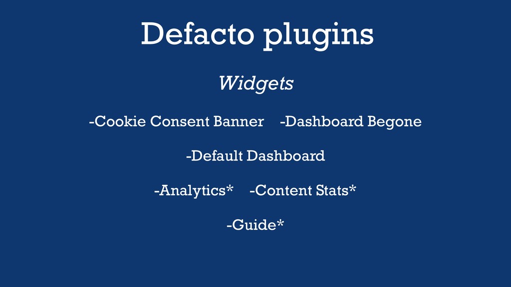 Defacto plugins Widgets -Cookie Consent Banner -Dashboard Begone -Default Dashboard