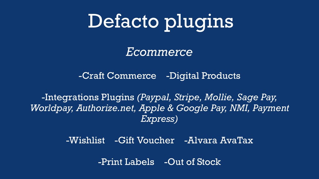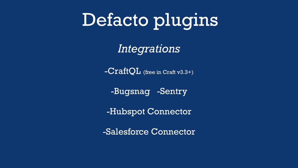 Defacto plugins Integrations -CraftQL (free in Craft v3.3+) -Bugsnag -Sentry