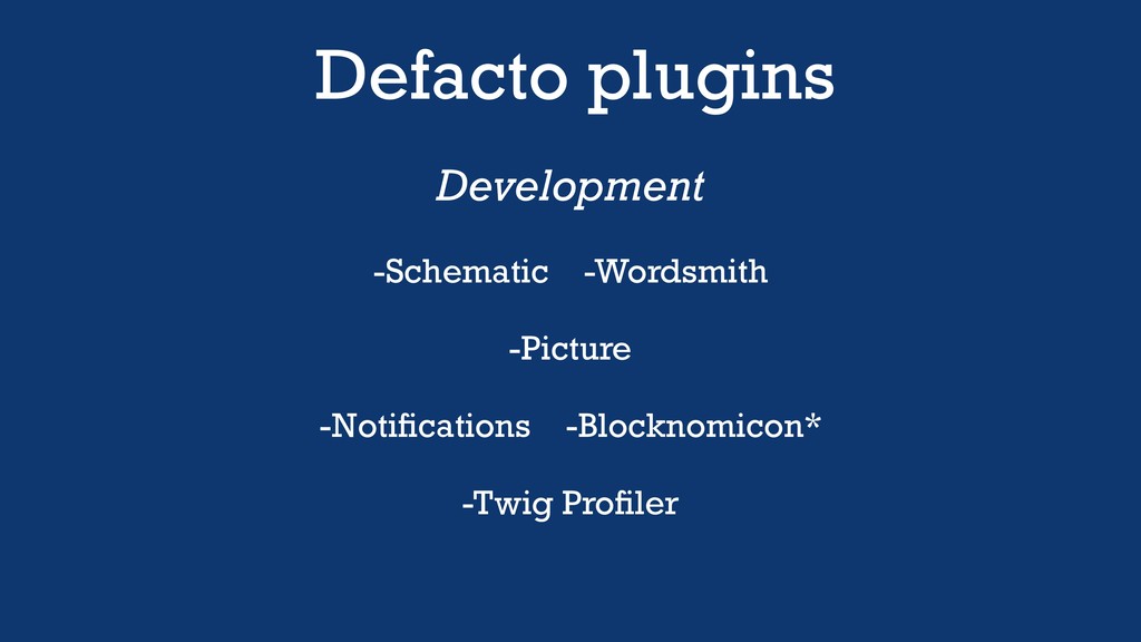 Defacto plugins Development -Schematic -Wordsmith -Picture -Notifications -Blocknomicon* -Twig Profiler