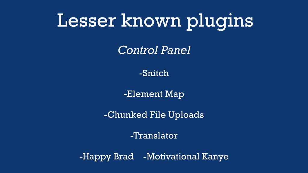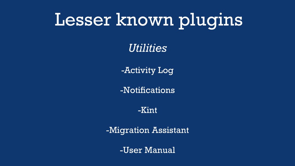Lesser known plugins Utilities -Activity Log -Notifications -Kint -Migration Assistant