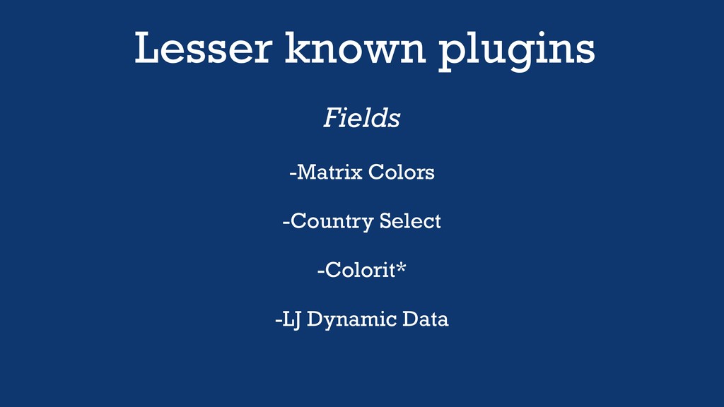 Lesser known plugins Fields -Matrix Colors -Country Select -Colorit* -LJ