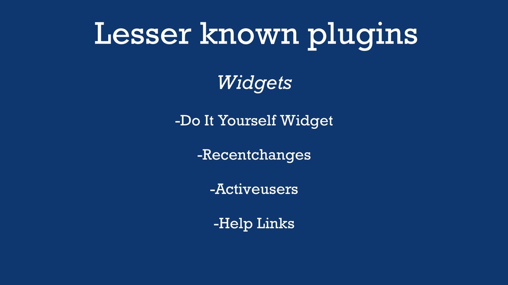 Lesser known plugins Widgets -Do It Yourself Widget -Recentchanges -Activeusers