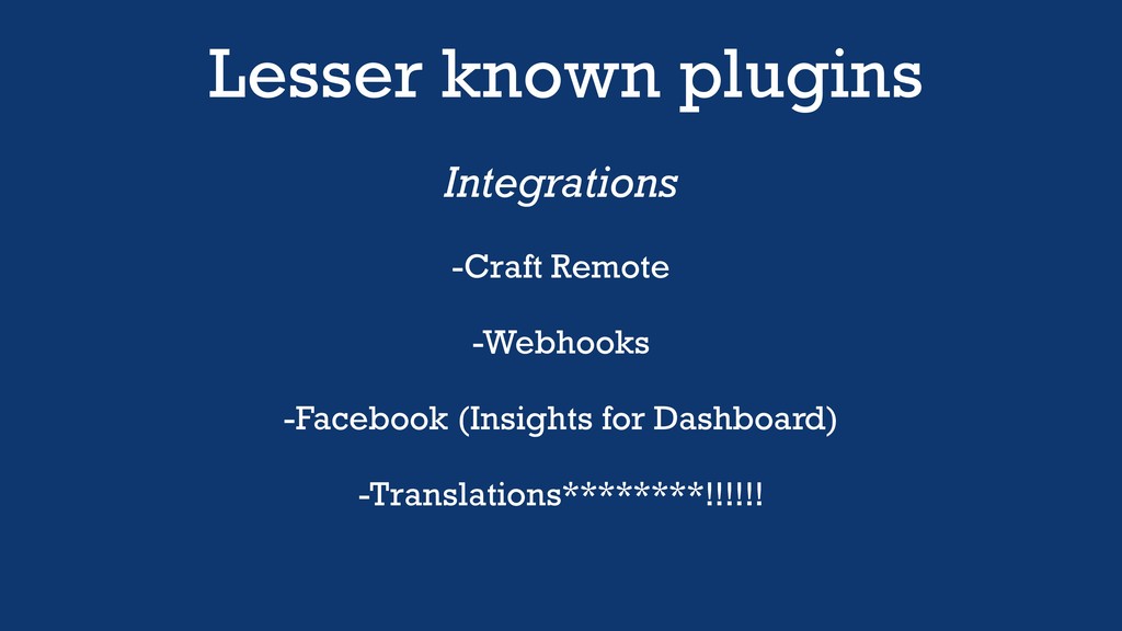 Lesser known plugins Integrations -Craft Remote -Webhooks -Facebook (Insights for