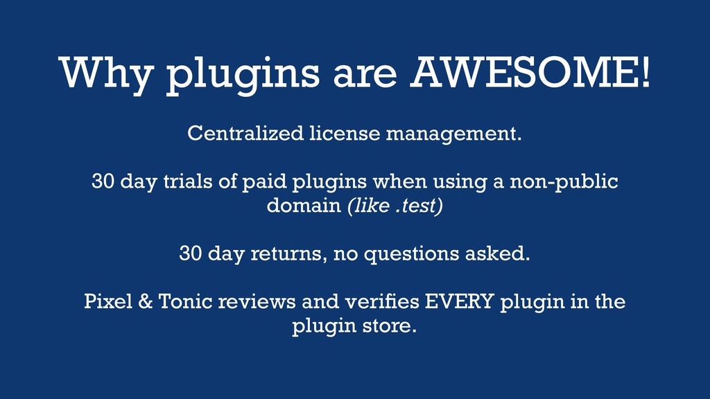Why plugins are AWESOME! Centralized license management. 30 day trials