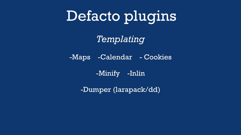 Defacto plugins Templating -Maps -Calendar - Cookies -Minify -Inlin -Dumper