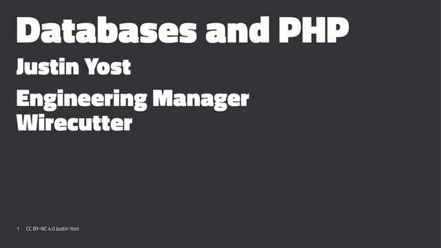 to connect to a database. • PDO includes drivers for; MySQL, MS SQL, PostgreSQL, SQLite and more • Data Access Abstraction Layer - same PDO function to connect, run statements, return results, etc • Does not abstract away differences in the actual query language or engine 9 CC BY-NC 4.0 Justin Yost