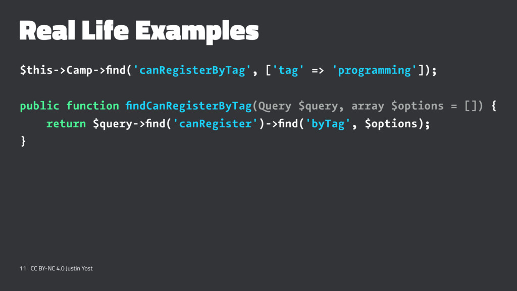 array $options = []) { if (!isset($options['tag'])) { throw new BadMethodCallException('Requires an option param of `tag` to be set'); } return $query ->matching('Tags', function ($q) use ($options) { return $q->where([ 'Tags.slug' => $options['tag'], ]); }); } 10 CC BY-NC 4.0 Justin Yost