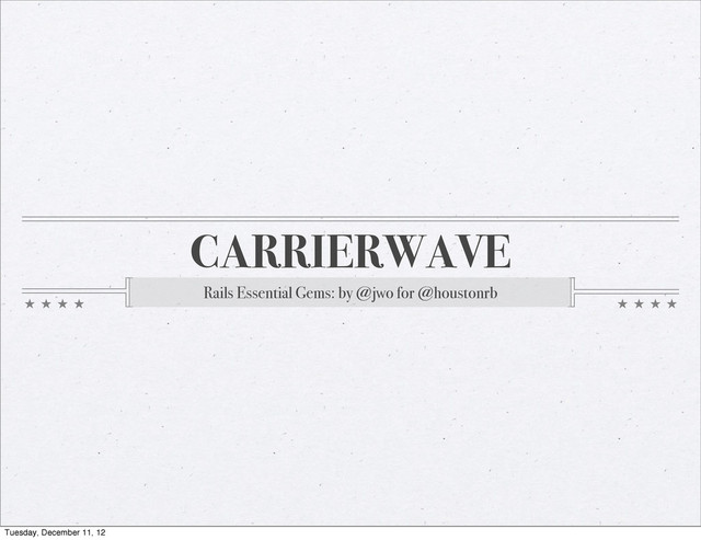 use Fog in test mode [really, don't even process attachments in test] 3. Know what resize_to_fill vs resize_and_page 4. Create your buckets ahead of time 5. For PDFs and files, add Tuesday, December 11, 12