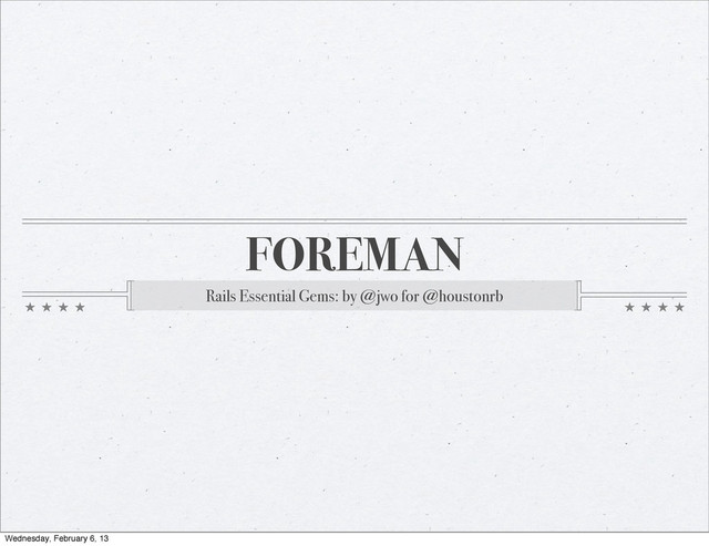 out of code Gives developer their own S3 bucket and stuff Works extraordinarily well with Heroku Helps follow http://www.12factor.net/ Wednesday, February 6, 13
