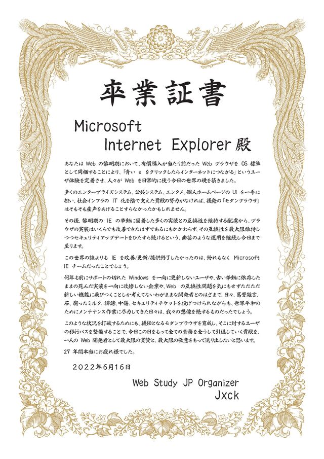 Explorer 殿 あなたは Web の黎明期におい て 、 有償購入が当た り 前だ っ た Web ブラ ウザを OS 標準 と し て 同梱す る こ と によ り 、 「青い e を ク リ ッ ク し た ら イ ン タ ー ネ ッ ト につなが る 」 と い う ユー ザ体験を定着さ せ 、 人 々が Web を 日常的に使う今日 の世界の礎を築き ま し た。 多 く のエ ン タ ープラ イ ズシ ス テ ム、 公共シ ス テ ム、 エ ン タ メ 、 個人ホー ム ページ の UI を一手に 担い、 社会 イ ン フ ラ の IT 化を陰で支え た貴殿の努力がな ければ、 後発の 「 モ ダン ブラ ウザ 」 は そ も そ も産声を あげ る こ と す らなかっ たかも しれま せ ん。 そ の後、 黎明期の IE の挙動に固着 し た多 く の実装 と の 互換性を維持す る配慮から、 ブラ ウザの実装はい く ら でも改善 でき たはずであ る に もかかわ ら ず 、 そ の 互換性を最大限維持し つつセキ ュ リ テ ィ ア ッ プデー ト を ひ たす ら続け る と い う 、 曲芸の よ う な運用 を継続し今日 ま で 至 り ま す 。 こ の世界の誰よ り も IE を改善/更新/提供終 了 し たかっ たのは、 紛れ もな く Microsoft IE チー ムだっ た こ とで し ょ う 。 何年も 前に サポー ト の切れた Windows を一向に更新 し ない ユ ーザや 、 古い挙動に依存 し た ま ま の死んだ実装を一向に改修しない企業や 、 Web の互換性問題を気に もせずただただ 新しい機能に飛びつ く こ と しか考え て ないわが ま ま な開発者 と のはざ ま で 、 日 々 、 罵詈雑言、 石、 腐っ た ミ ルク 、 誹謗、 中傷、 セキ ュ リ テ ィ チケッ ト を投げつけられながらも、 世界平和の ためにメ ン テナ ン ス作業に尽力 し て き た 日 々 は、 我々 の想像を絶す る も の だ っ た で し ょ う 。 こ の よ う な状況を 打破す る た め に も 、 後任 と な る モ ダン ブラ ウザ を 育成 し 、 そ こ に対す るユ ーザ の移行パス を整備す る こ と で 、 今日 こ の 日 を も っ て 全て の責務を全う し て 引退し て い く 貴殿を 、 一 人の Web 開発者 と し て 最大限の賞賛 と 、 最大限の敬意 を も っ て送 り 出 し た い と 思 い ま す 。 27 年間本当にお疲れ様で し た。 Microsoft