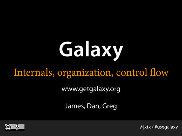 web application architecture 3. Control flow in the Galaxy web application 4. Tools in the age of the toolshed 5. Galaxy Workflows 6. Galaxy data organization