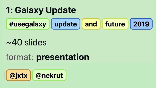 (~39 new since last year) - Tools: contributors to galaxyproject/tools-iuc: - ~195 (~38 new since last year) - ...and the ever vigilant Intergalactic Utilities Commission for handling these contributions and maintaining the quality of essential Galaxy tools - ...and everyone else who has contributed a tool to the ToolShed - Training: contributors to galaxyproject/training-material - ~114 (~34 new since last year) - ...and everyone who has conducted or attended Galaxy Training - Everyone who has contributed to Galaxy in other ways: - users, supporters, … - Funding: NSF and NIH (to our team), and all of the funders of the Global Galaxy Community