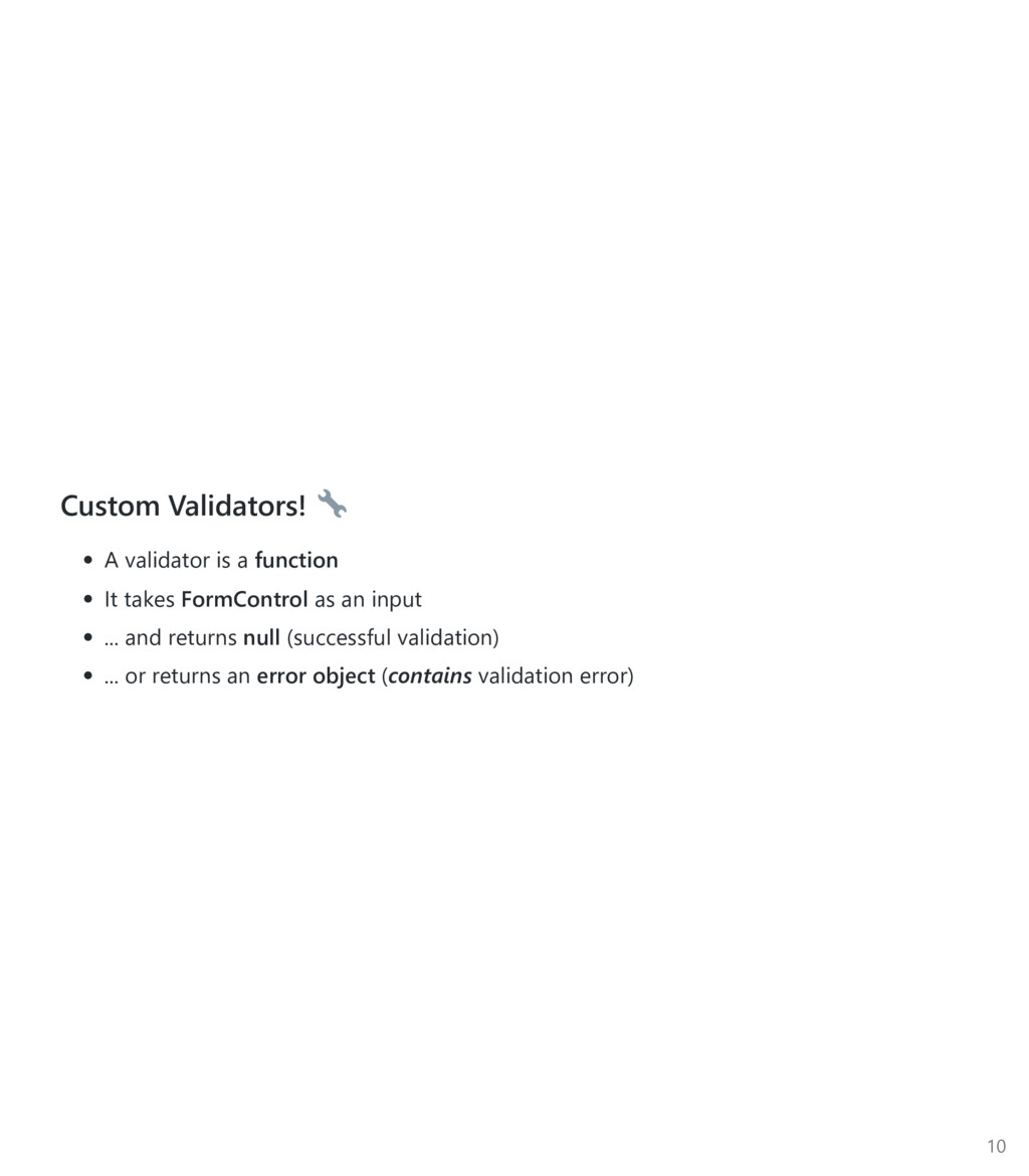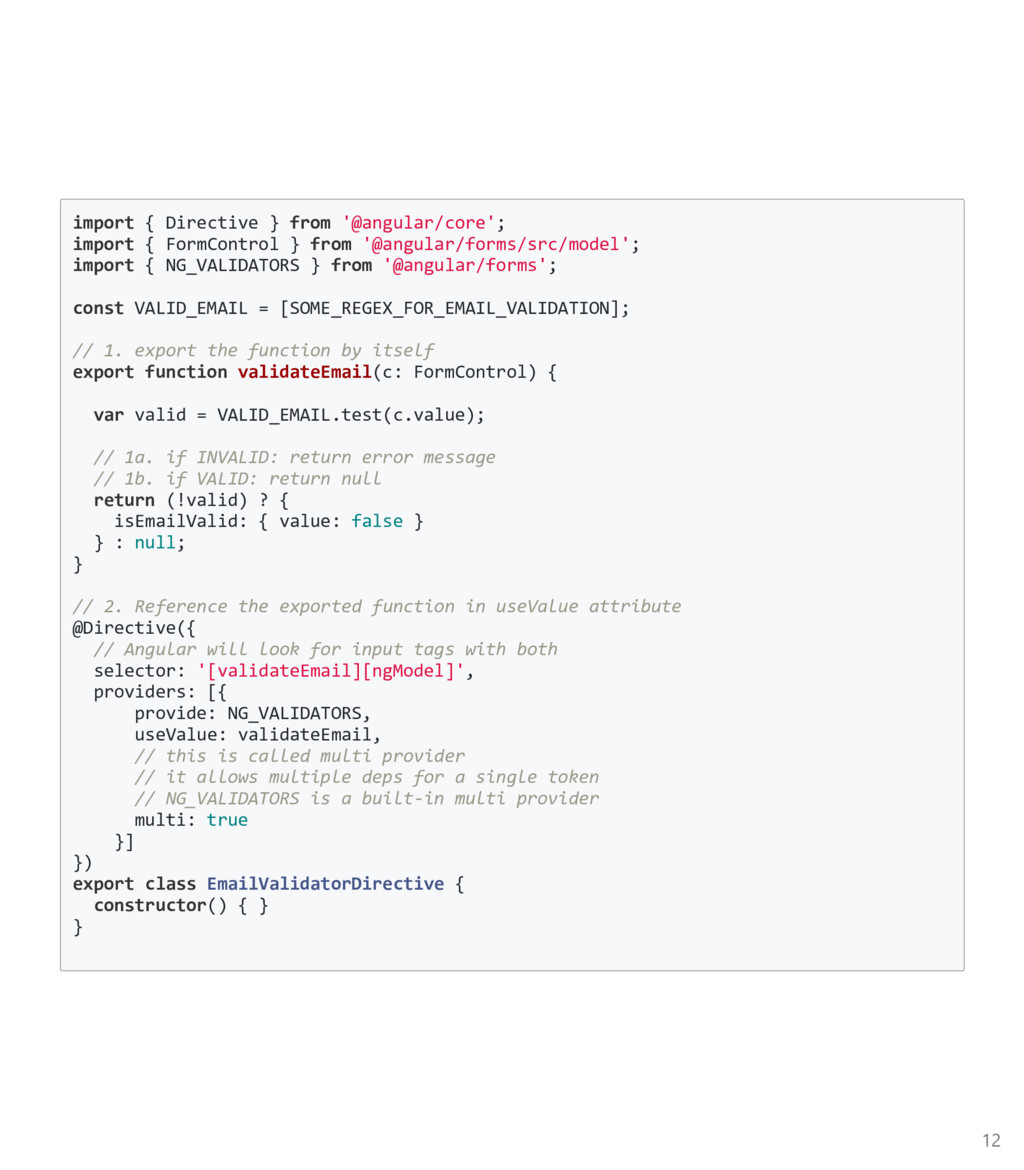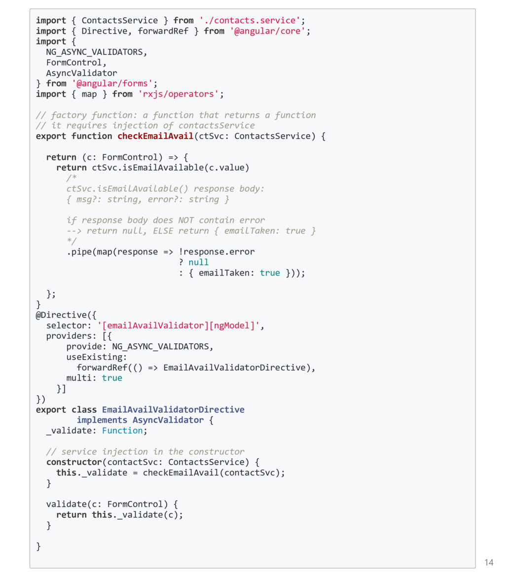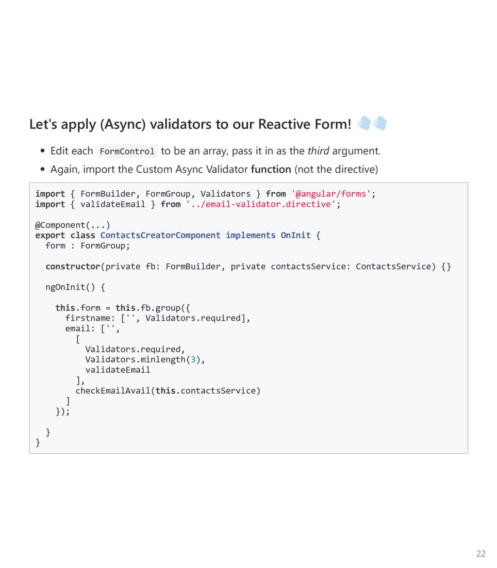 FormControl to be an array, pass it in as the third argument. Again, import the Custom Async Validator function ﴾not the directive﴿ import { FormBuilder, FormGroup, Validators } from '@angular/forms'; import { validateEmail } from '../email‐validator.directive'; @Component(...) export class ContactsCreatorComponent implements OnInit { form : FormGroup; constructor(private fb: FormBuilder, private contactsService: ContactsService) {} ngOnInit() { this.form = this.fb.group({ firstname: ['', Validators.required], email: ['', [ Validators.required, Validators.minlength(3), validateEmail ], checkEmailAvail(this.contactsService) ] }); } } 22