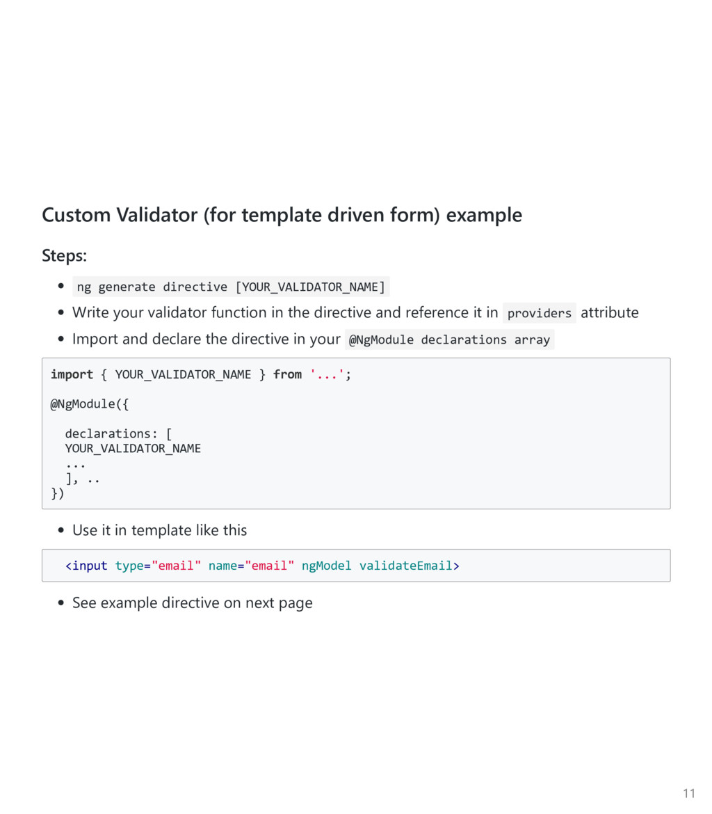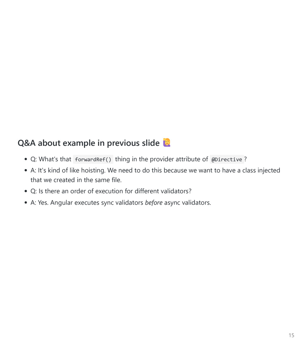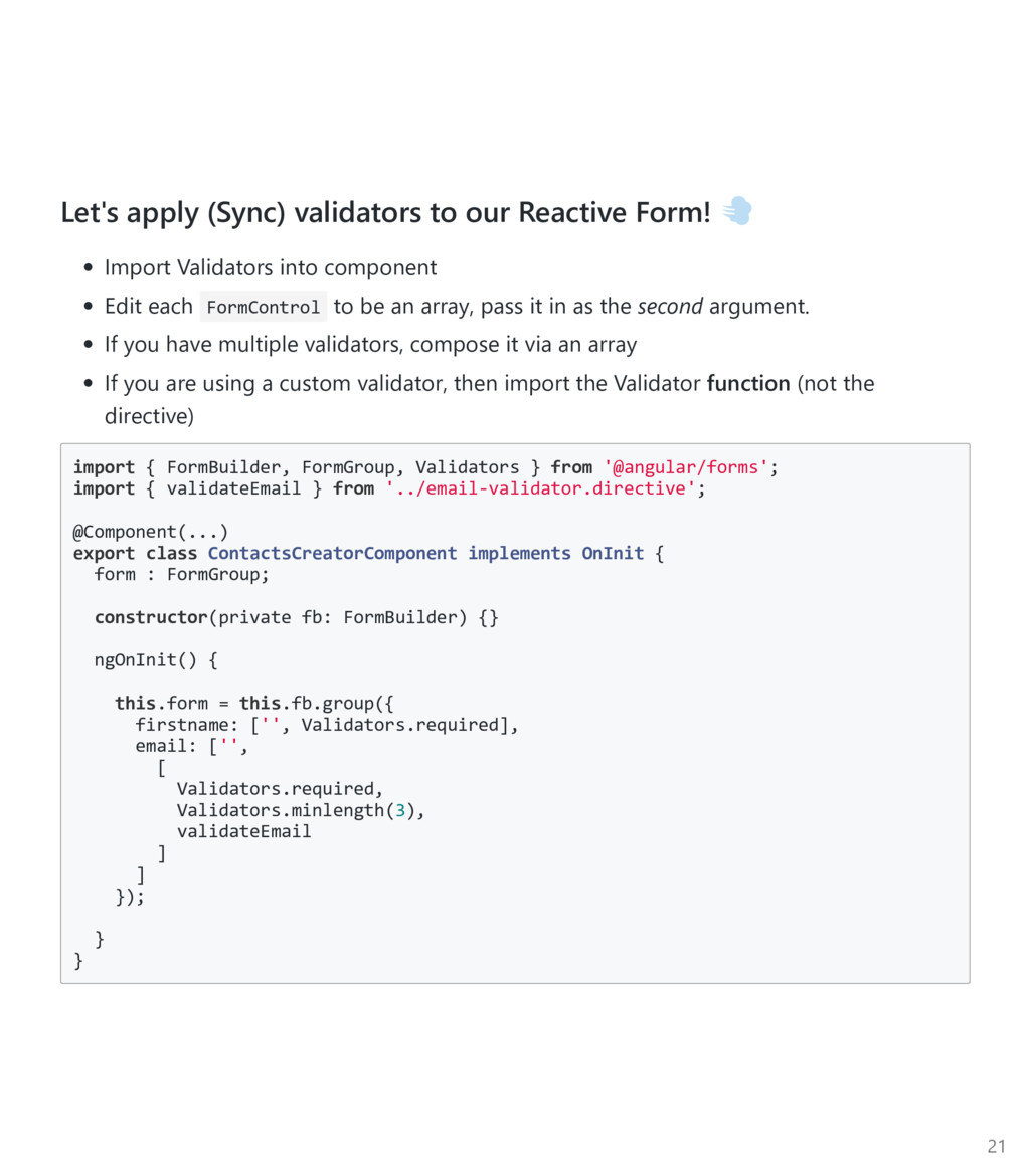 FormControl to be an array, pass it in as the third argument. Again, import the Custom Async Validator function ﴾not the directive﴿ import { FormBuilder, FormGroup, Validators } from '@angular/forms'; import { validateEmail } from '../email‐validator.directive'; @Component(...) export class ContactsCreatorComponent implements OnInit { form : FormGroup; constructor(private fb: FormBuilder, private contactsService: ContactsService) {} ngOnInit() { this.form = this.fb.group({ firstname: ['', Validators.required], email: ['', [ Validators.required, Validators.minlength(3), validateEmail ], checkEmailAvail(this.contactsService) ] }); } } 22