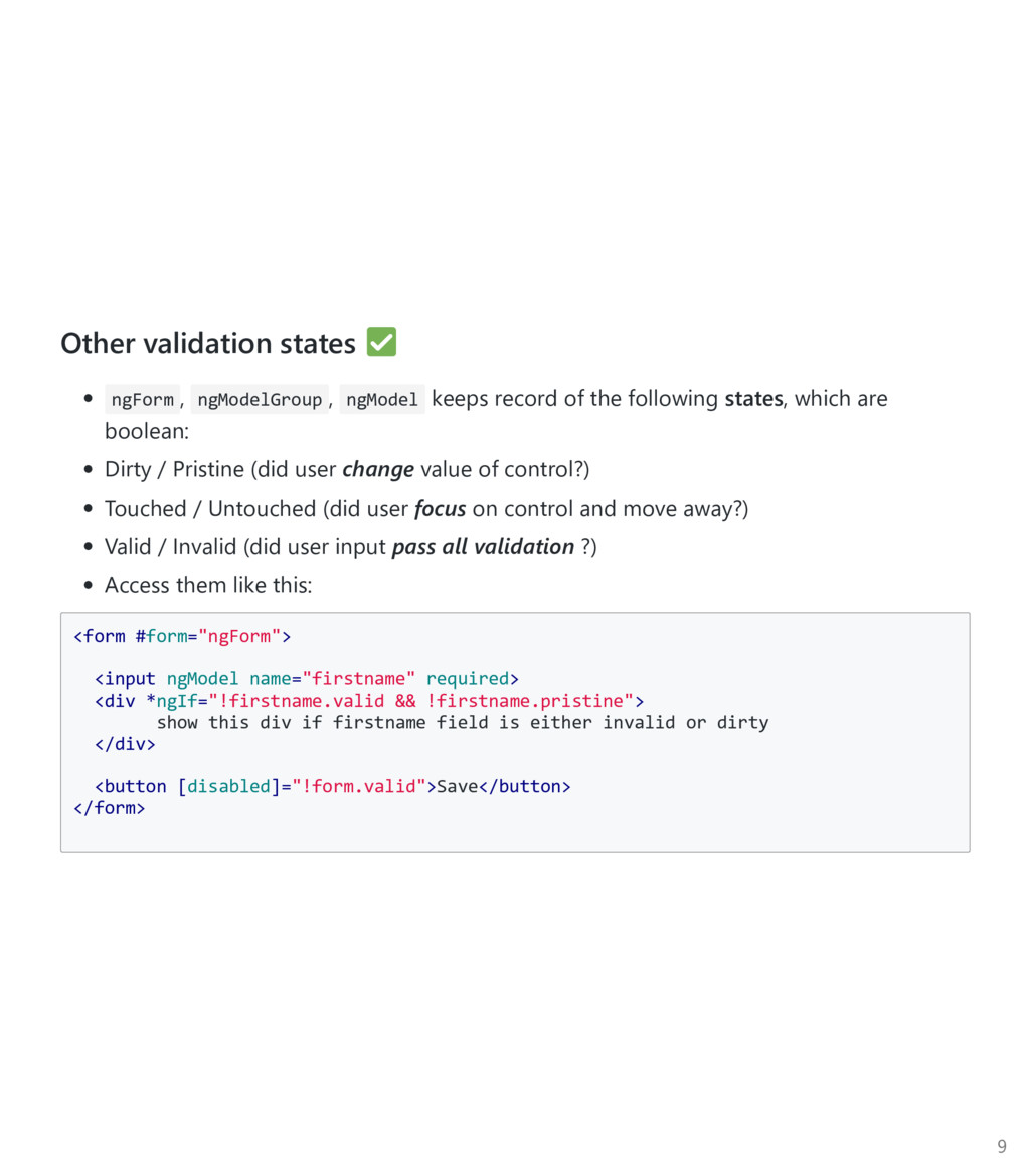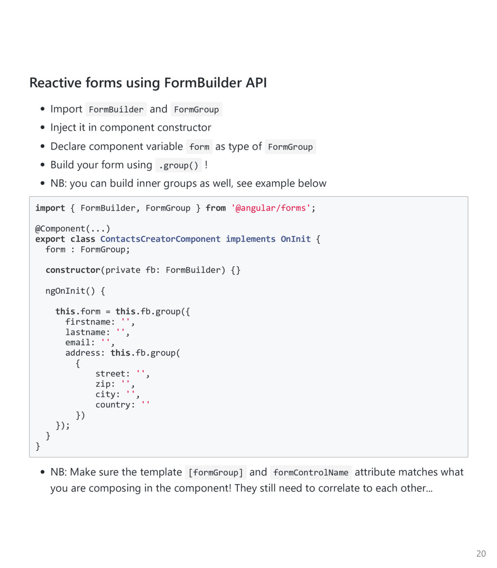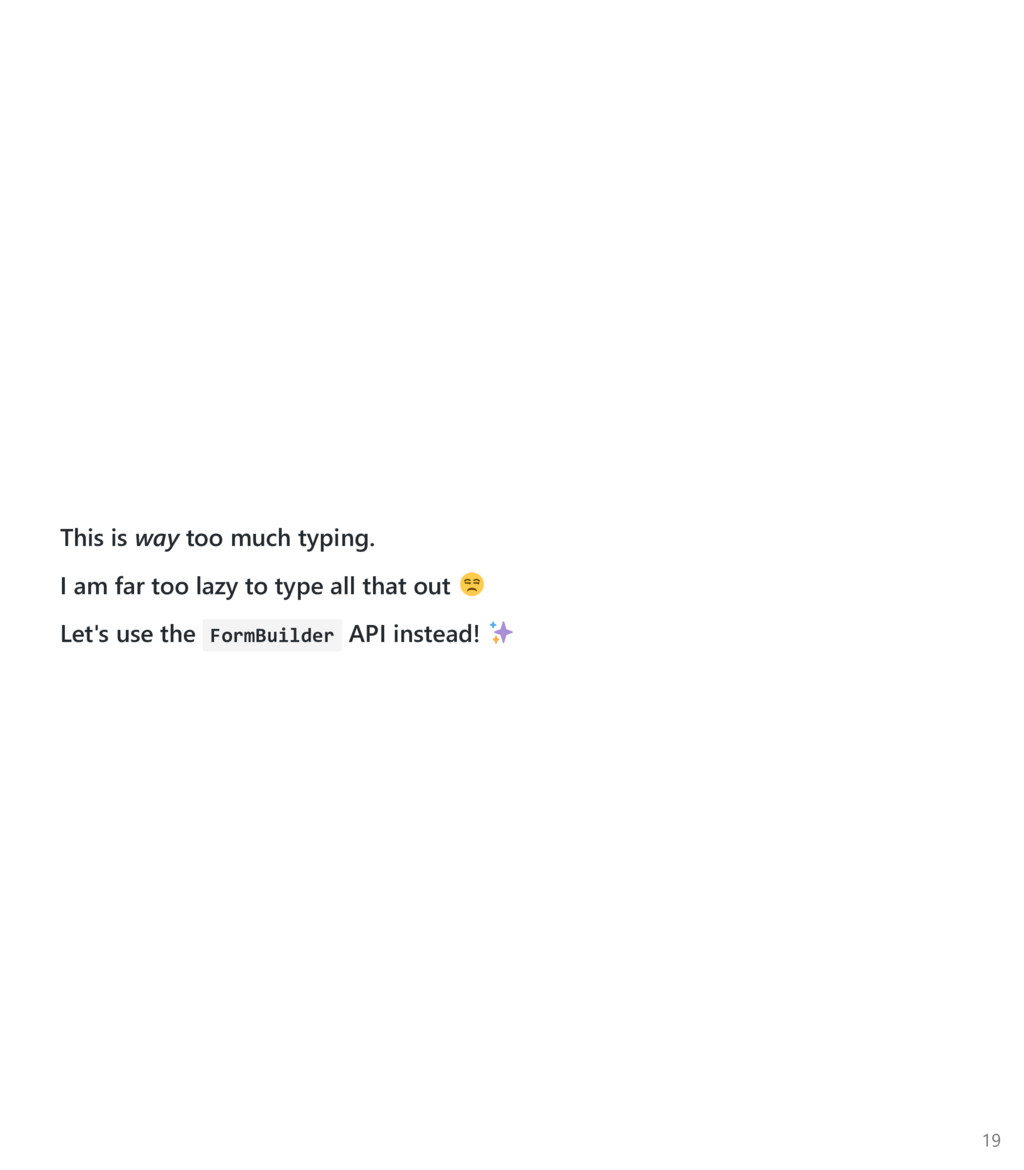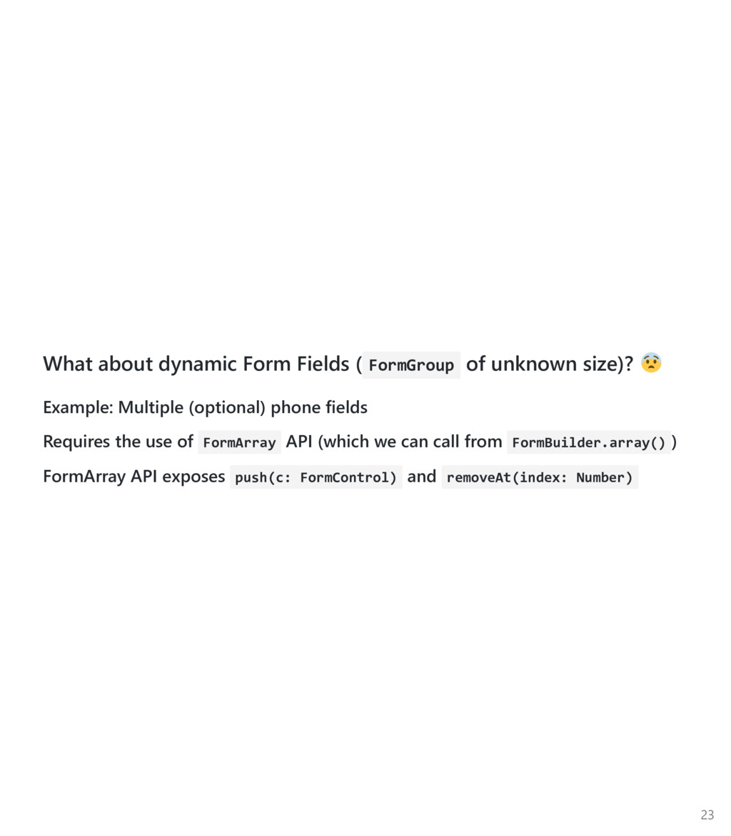 FormControl to be an array, pass it in as the third argument. Again, import the Custom Async Validator function ﴾not the directive﴿ import { FormBuilder, FormGroup, Validators } from '@angular/forms'; import { validateEmail } from '../email‐validator.directive'; @Component(...) export class ContactsCreatorComponent implements OnInit { form : FormGroup; constructor(private fb: FormBuilder, private contactsService: ContactsService) {} ngOnInit() { this.form = this.fb.group({ firstname: ['', Validators.required], email: ['', [ Validators.required, Validators.minlength(3), validateEmail ], checkEmailAvail(this.contactsService) ] }); } } 22