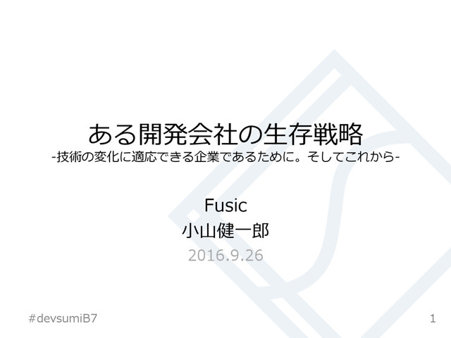ある開発会社の⽣存戦略 -技術の変化に適応できる企業であるために。そしてこれから- Fusic ⼩⼭健⼀郎 2016.9.26 1 #devsumiB7