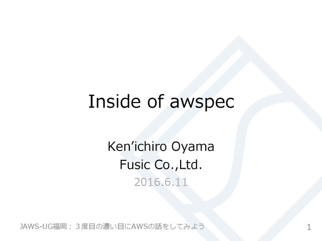 its(:instance_id) { should eq 'i-ec12345a' } its(:instance_type) { should eq ’t2.small' } its(:public_ip_address) { should eq '123.0.456.789' } it { should have_security_group('my-sg-name') } it { should belong_to_vpc('my-vpc') } it { should belong_to_subnet('subnet-1234a567') } it { should have_eip('123.0.456.789') } it { should be_disabled_api_termination } end 6 JAWS-‐‑‒UG福岡:3度度⽬目の濃い⽬目にAWSの話をしてみよう