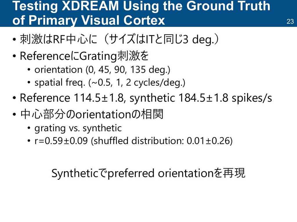 • fc6の空間で近い画像を⾒る(NNの⾼レイヤはレスポンス を予測できるため[Yamins et al., 2014] ) • face-preferring neurons: ニューロンのselectivityと⼀貫 • place-preferring neurons: 直線の輪郭がある様々な画像 • PITとCITのtuning • PIT: radial grating[Pigarev et al., 2002] , color[Zeki, 1977] , single eye[Issa and DiCarlo, 2012] • CIT: distinct face axes[Chang and Tsao, 2017; Freiwald et al., 2009] • 今回の結果: 両⽅ともcomplex もっとabstractなパラメータ (軸など[Chang and Tsao, 2017; Freiwald et al., 2009; Leopold et al., 2006] ) にチューンしてObjectを区別しているのでは? 26