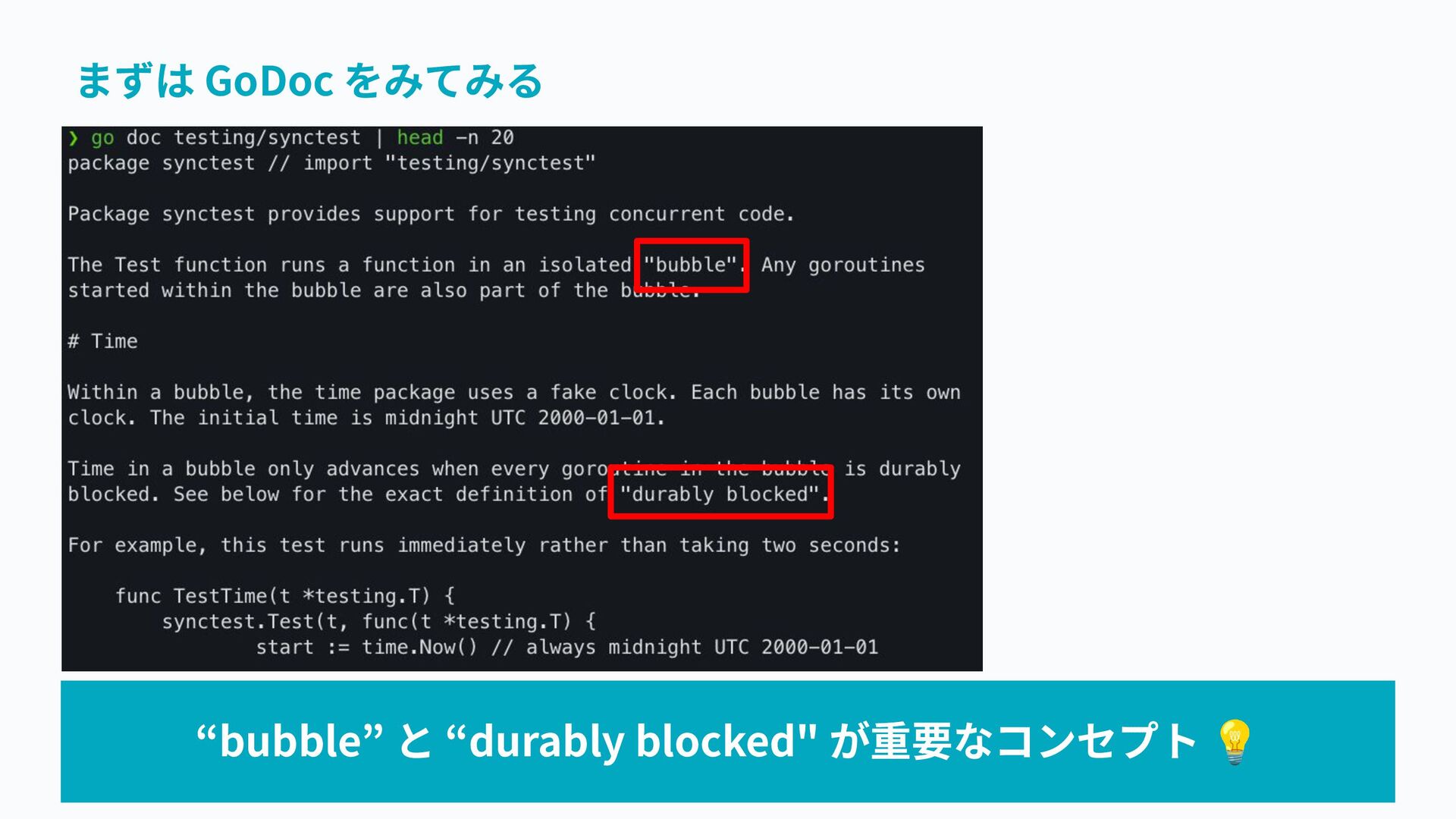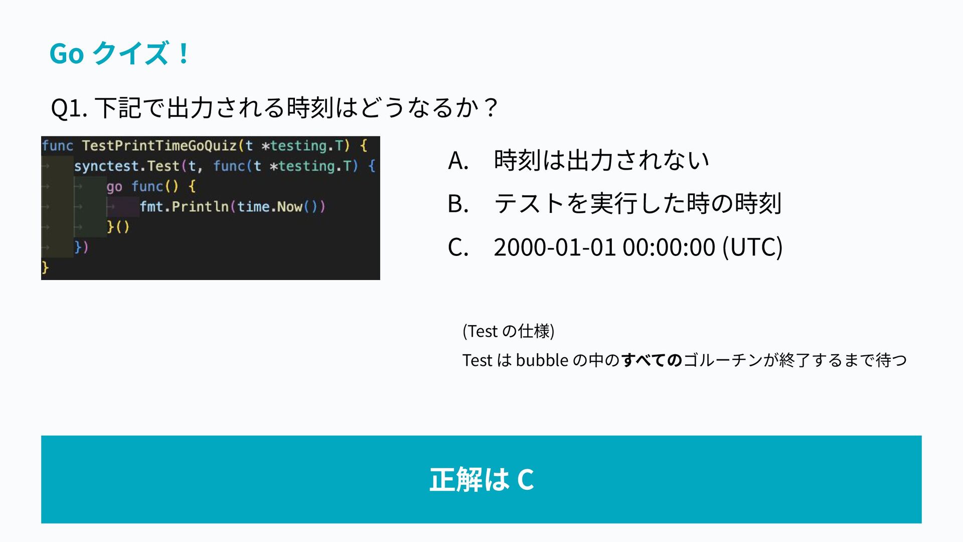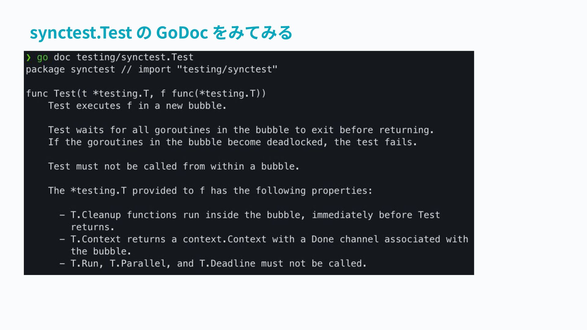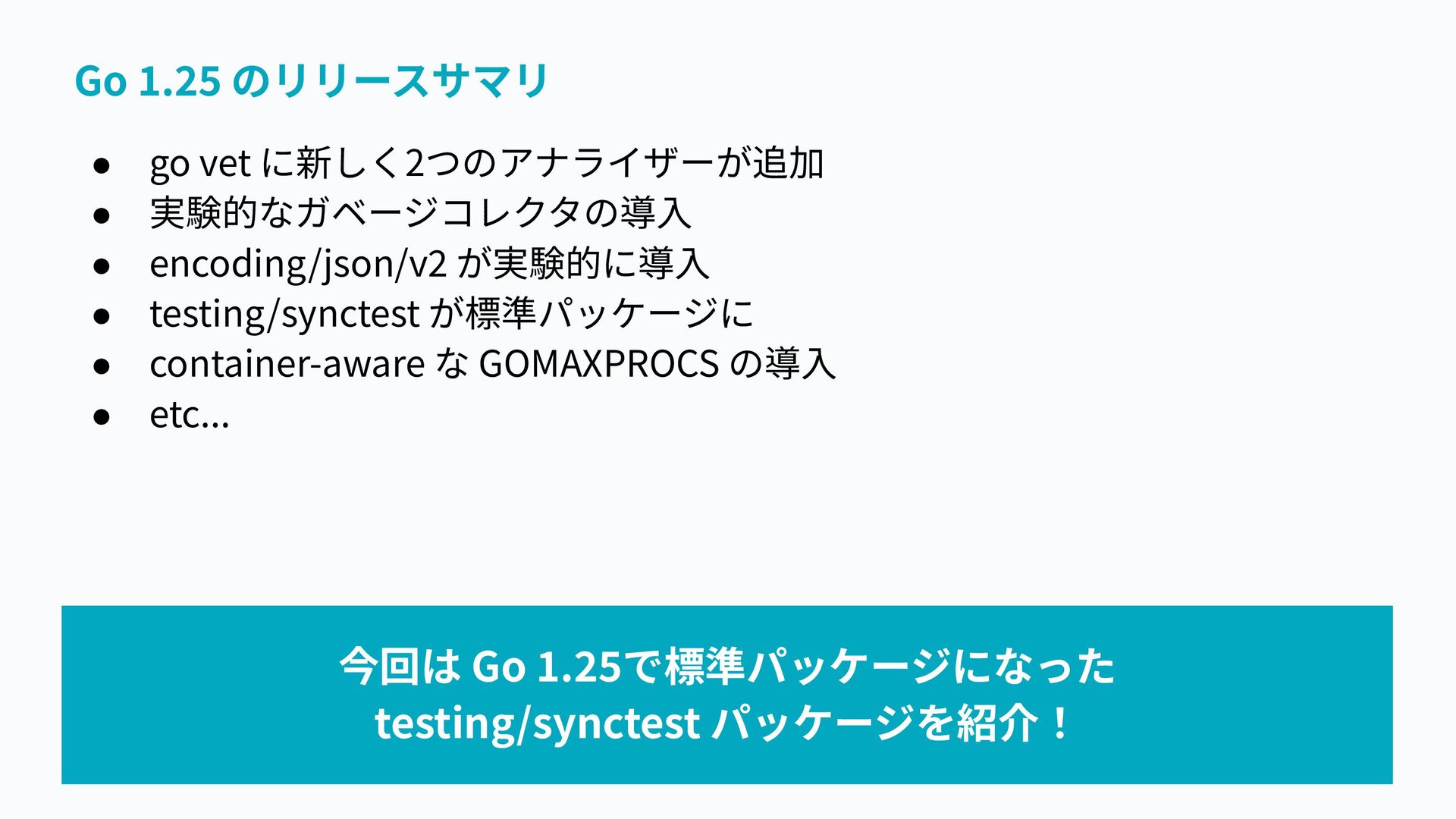 実験コードを交えての解説 a. GoDoc を読む b. Run / Test がそれぞれどのような役割があるのか 4. Go クイズ! 5. 弊社での実際の活⽤例 6. Go 1.24からの変更点 7. 今後の展望 8. API の内部実装(時間があれば) testing/synctest を完全理解する!