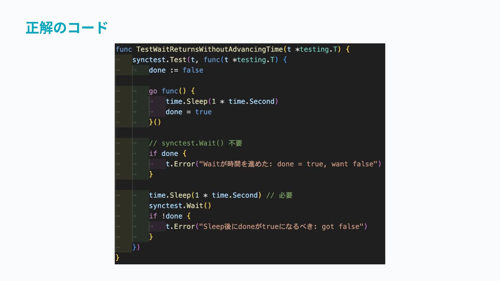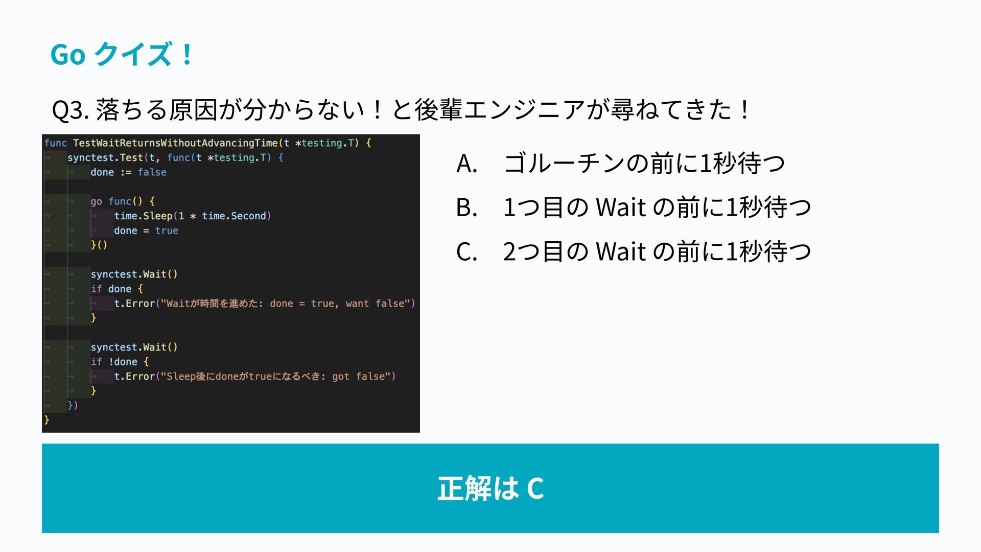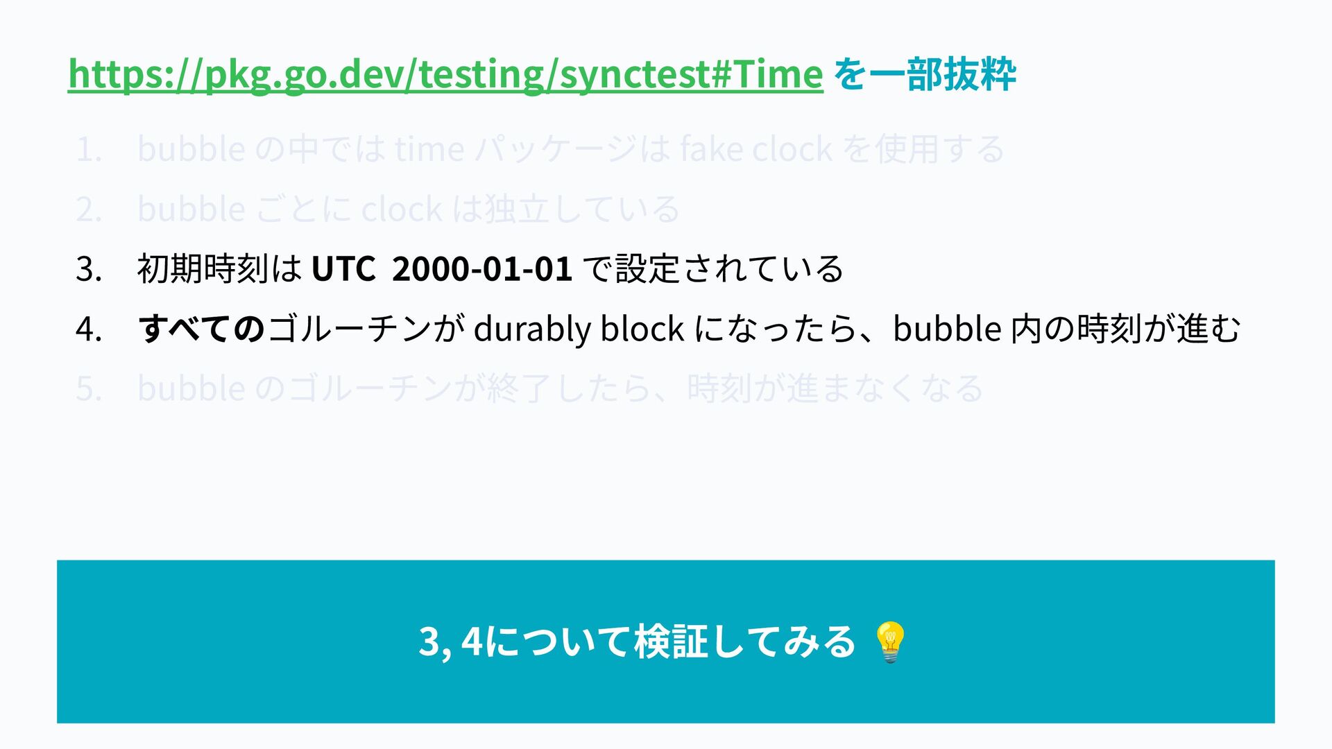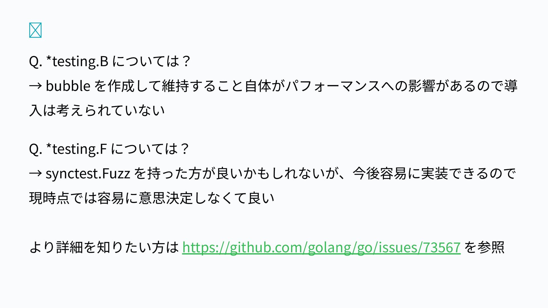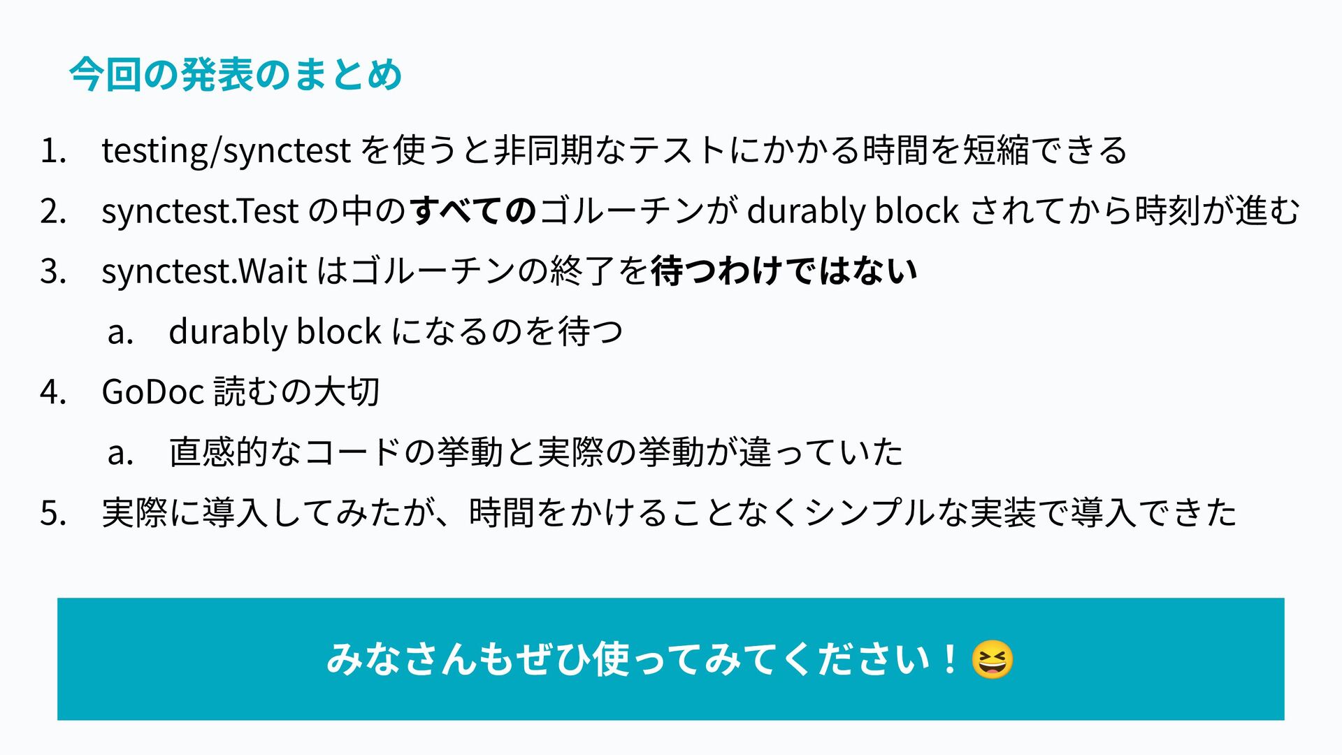 実験コードを交えての解説 a. GoDoc を読む b. Run / Test がそれぞれどのような役割があるのか 4. Go クイズ! 5. 弊社での実際の活⽤例 6. Go 1.24からの変更点 7. 今後の展望 8. API の内部実装(時間があれば) testing/synctest を完全理解する!