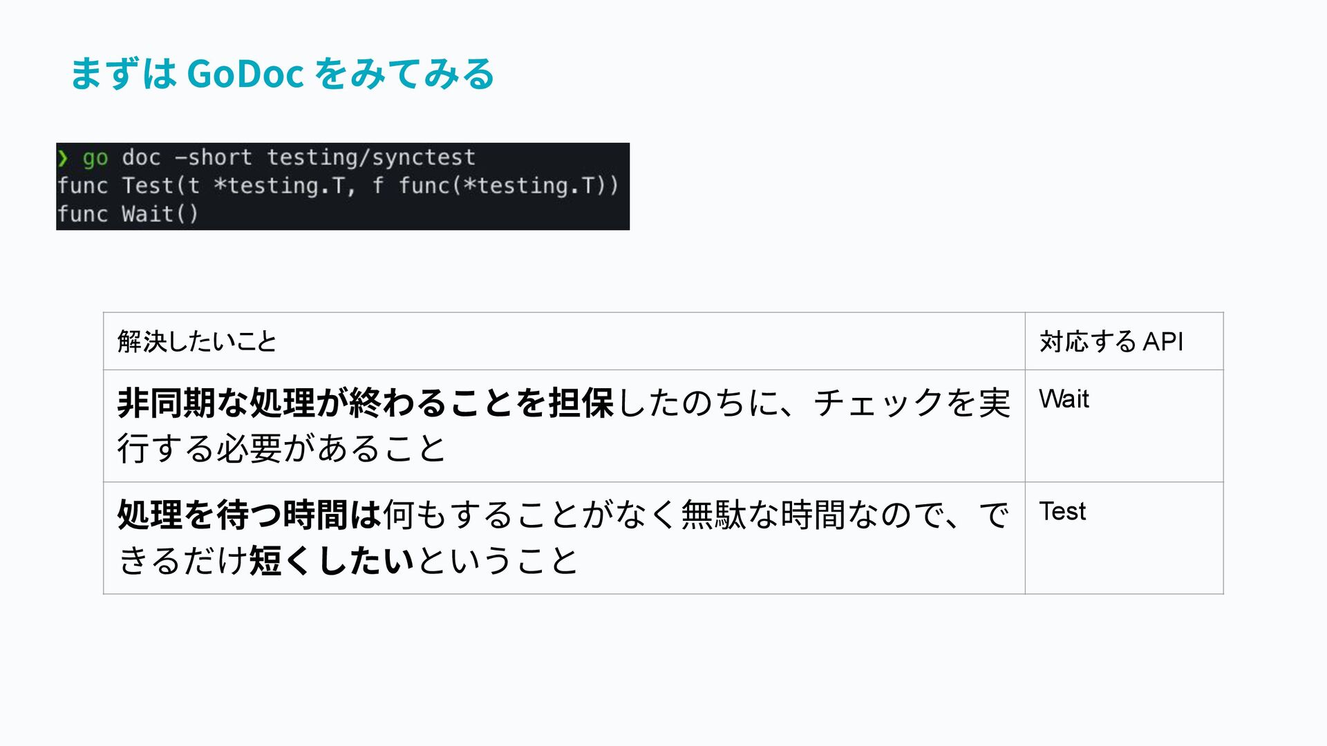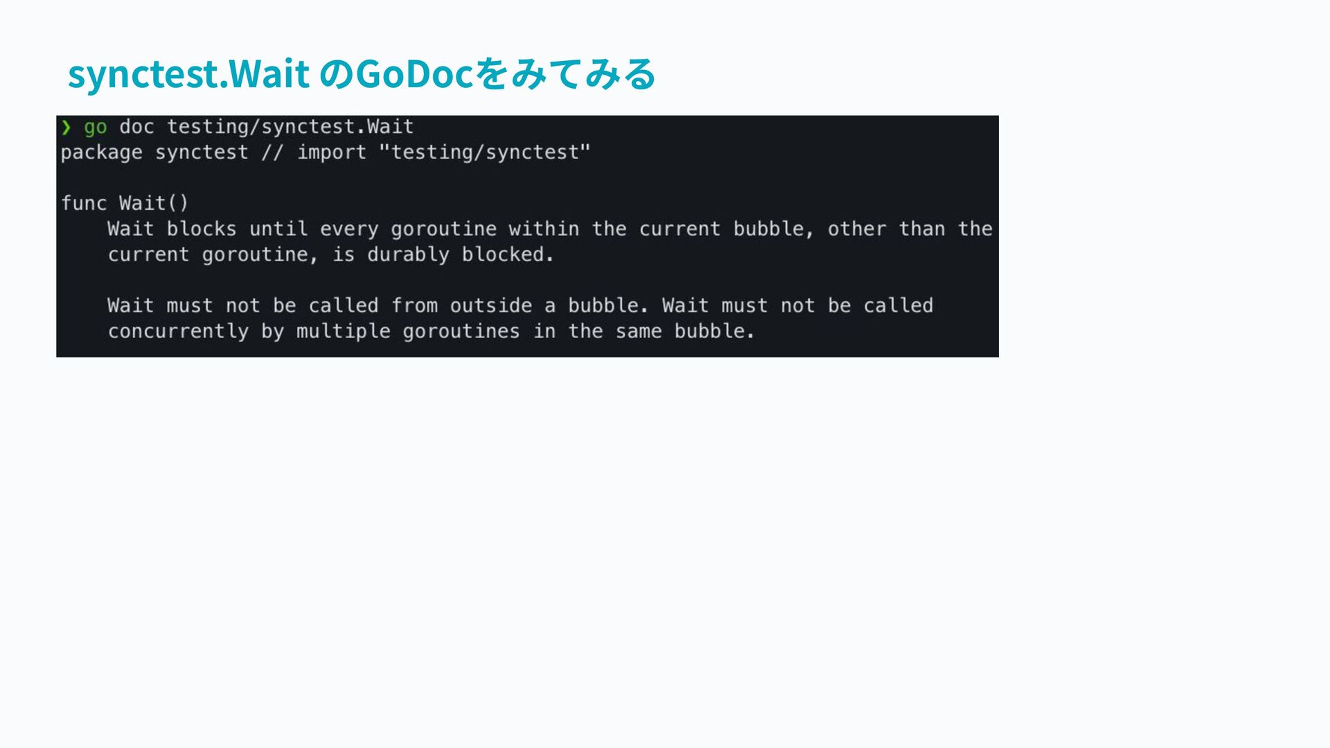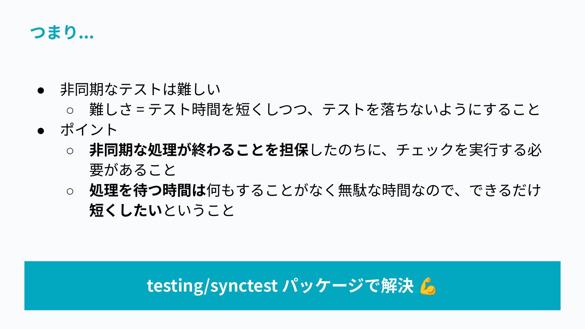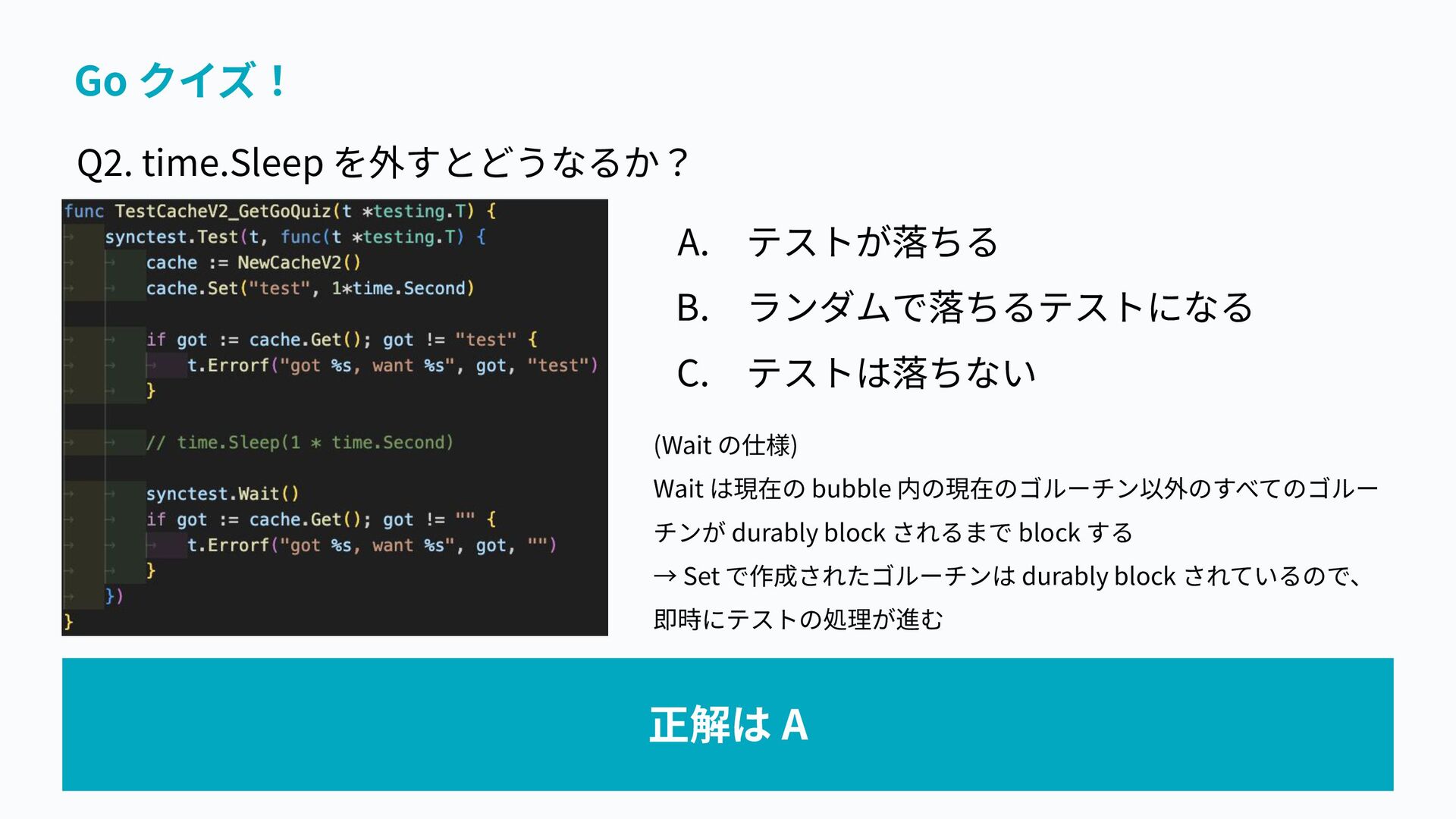 実験コードを交えての解説 a. GoDoc を読む b. Run / Test がそれぞれどのような役割があるのか 4. Go クイズ! 5. 弊社での実際の活⽤例 6. Go 1.24からの変更点 7. 今後の展望 8. API の内部実装(時間があれば) testing/synctest を完全理解する!