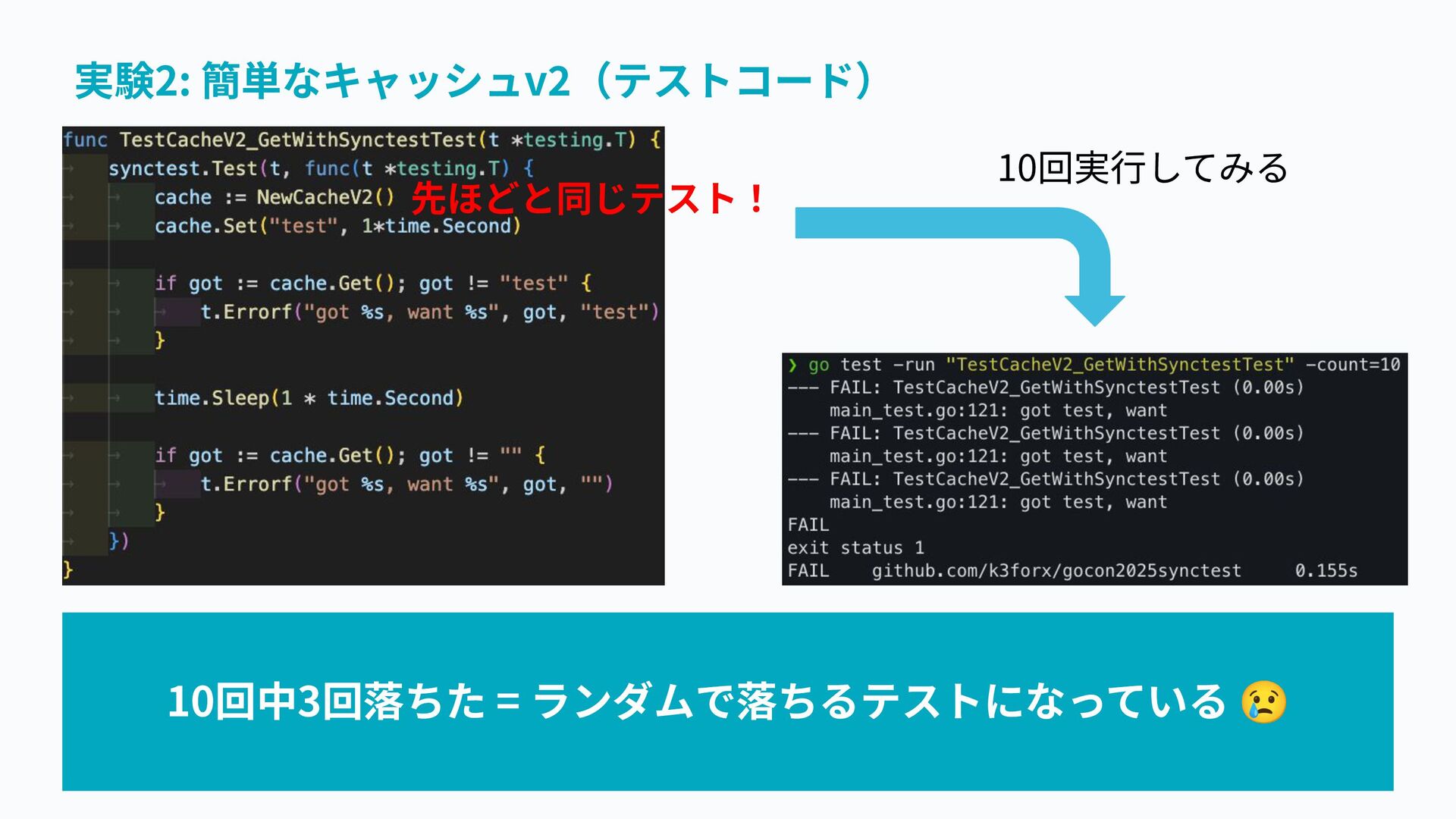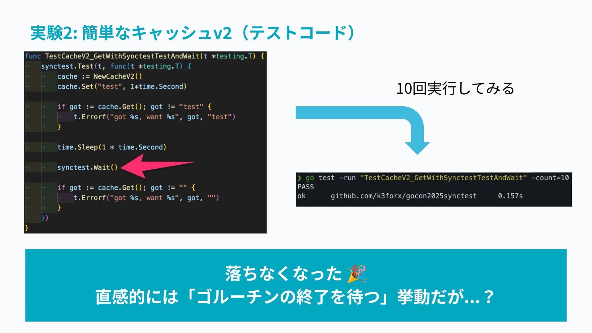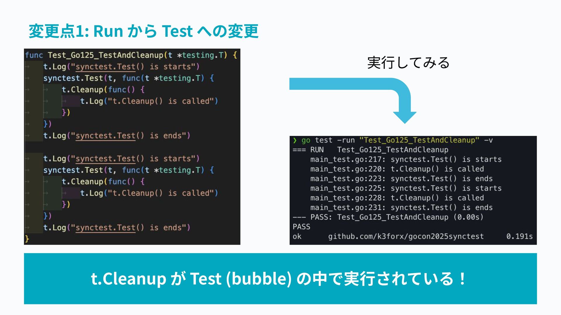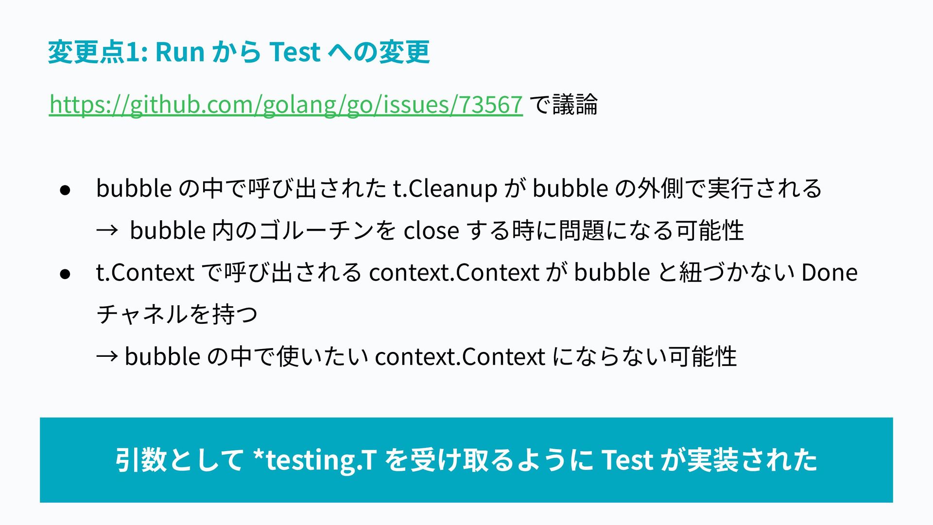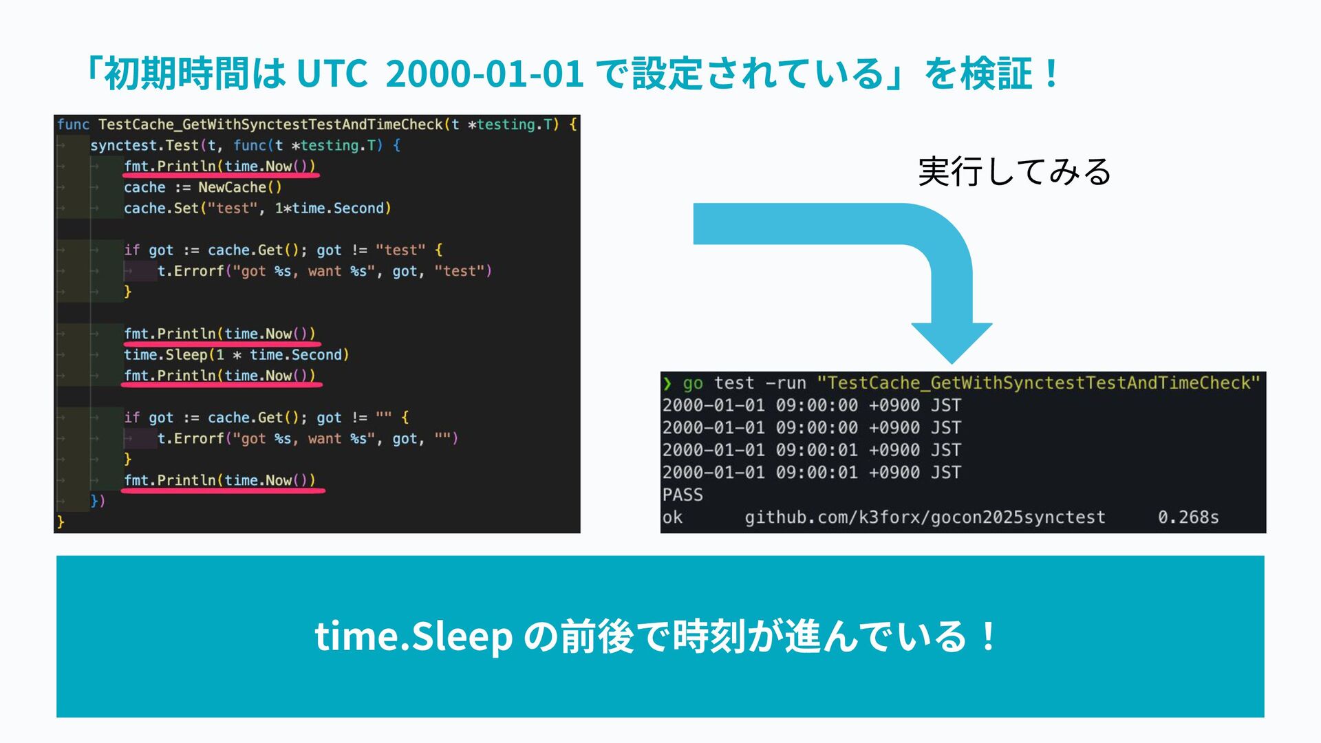 実験コードを交えての解説 a. GoDoc を読む b. Run / Test がそれぞれどのような役割があるのか 4. Go クイズ! 5. 弊社での実際の活⽤例 6. Go 1.24からの変更点 7. 今後の展望 8. API の内部実装(時間があれば) testing/synctest を完全理解する!