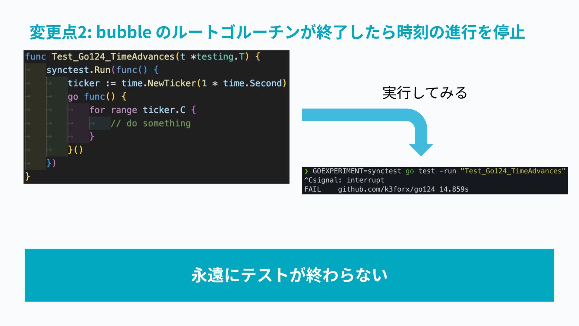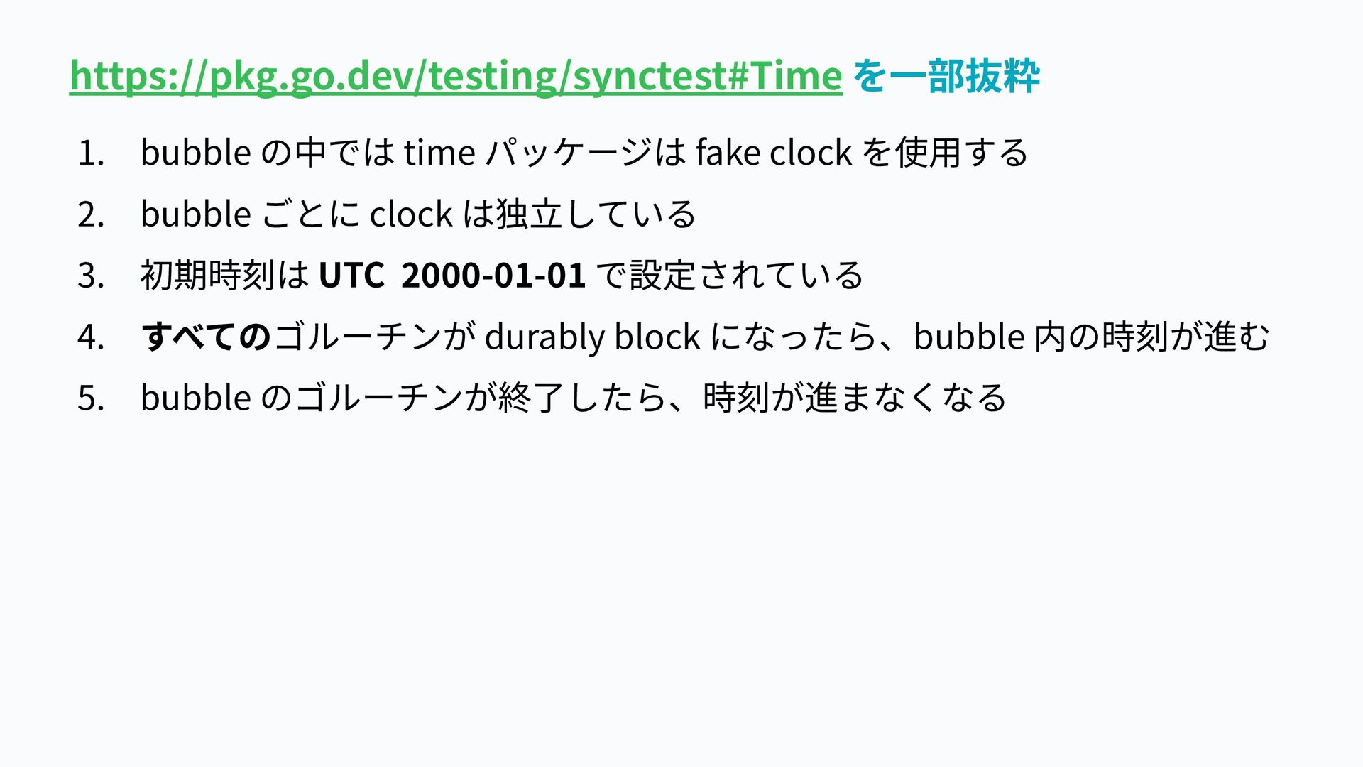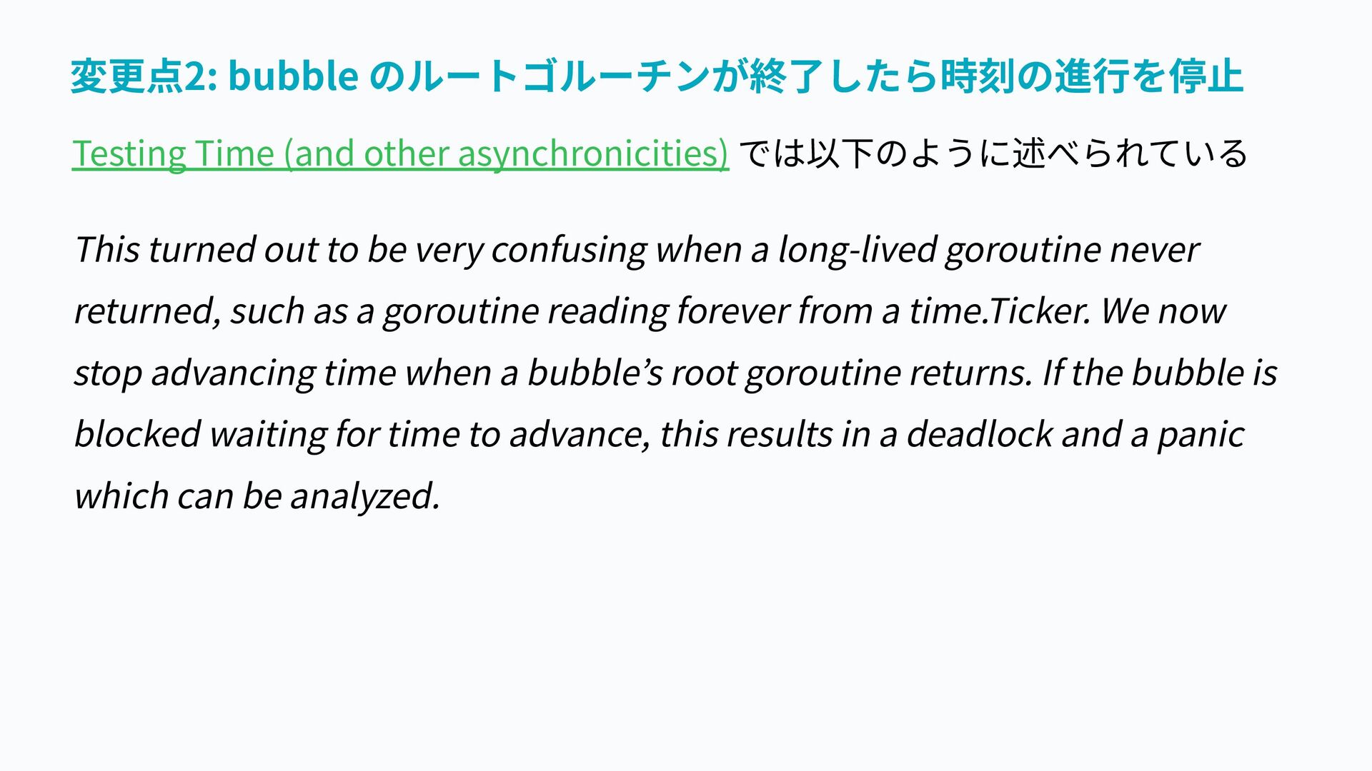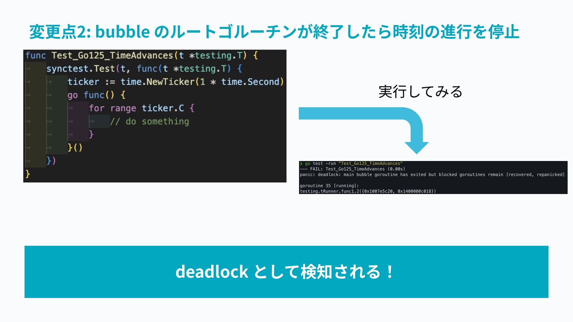 turned out to be very confusing when a long-lived goroutine never returned, such as a goroutine reading forever from a time.Ticker. We now stop advancing time when a bubble’s root goroutine returns. If the bubble is blocked waiting for time to advance, this results in a deadlock and a panic which can be analyzed.