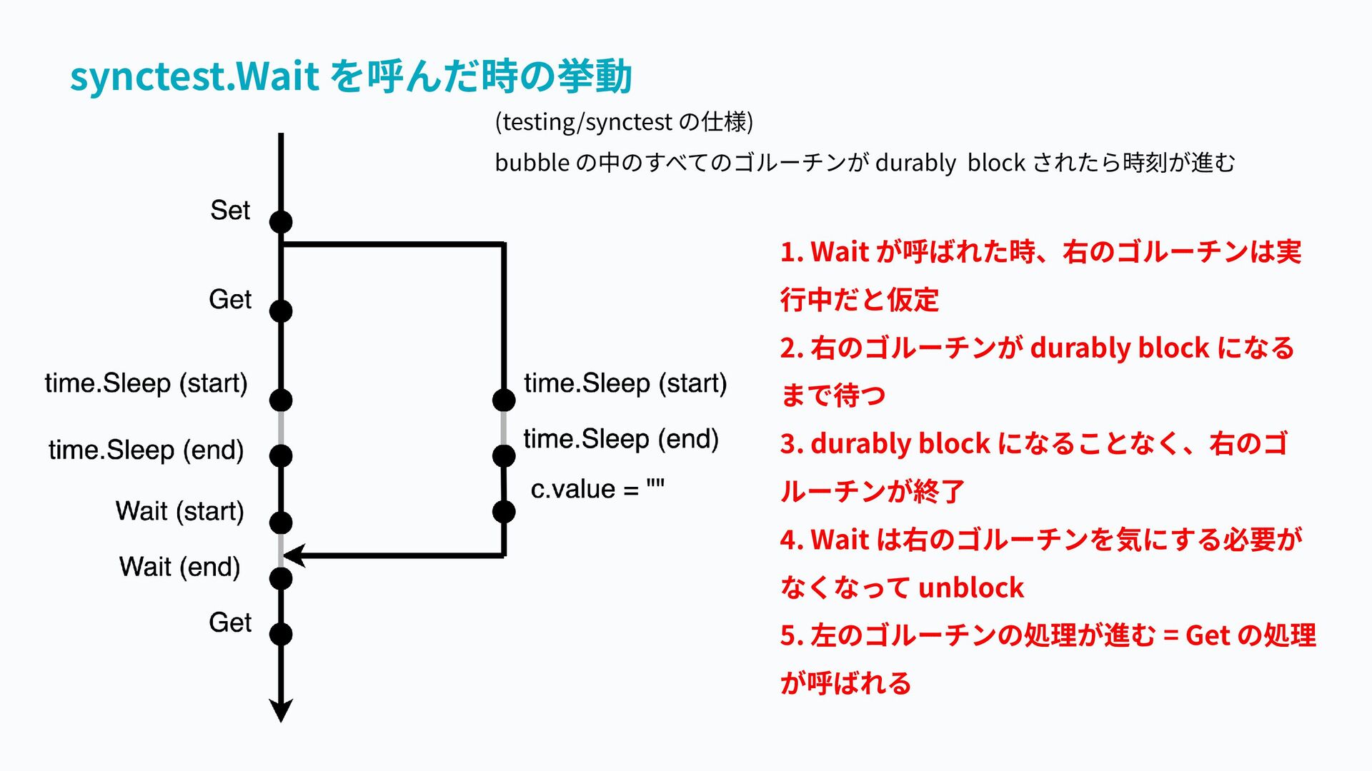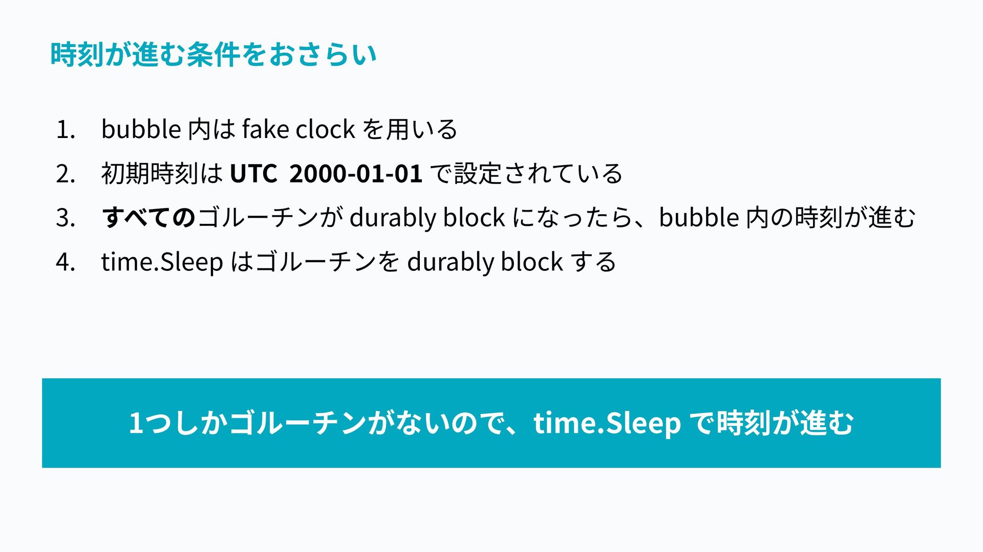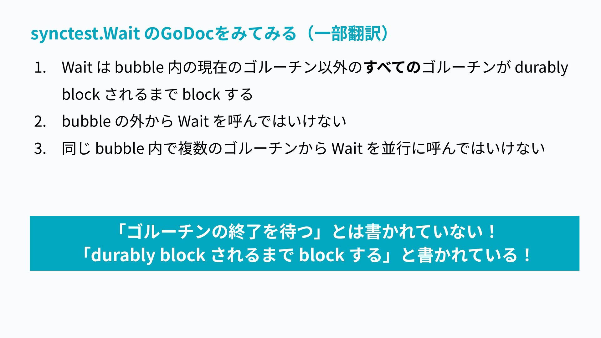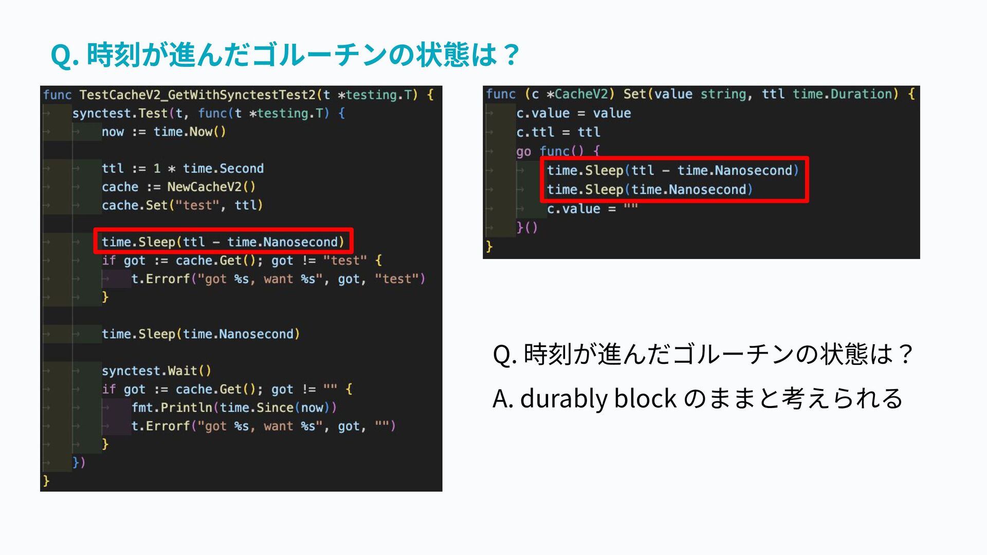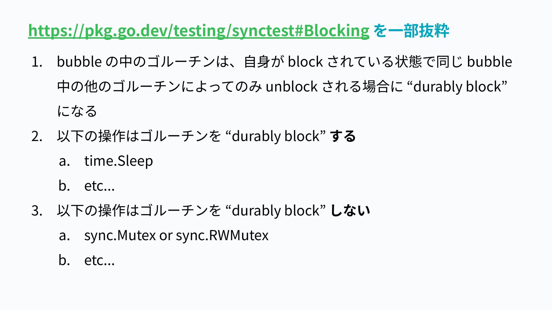 される場合に “durably block” になる 2. 以下の操作はゴルーチンを “durably block” する a. time.Sleep b. etc... 3. 以下の操作はゴルーチンを “durably block” しない a. sync.Mutex or sync.RWMutex b. etc...