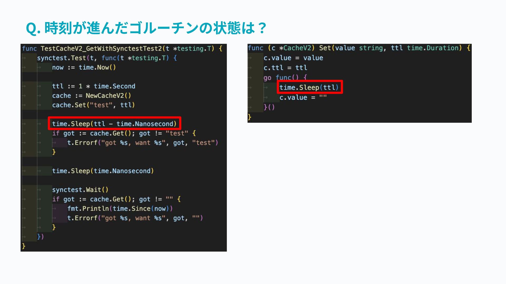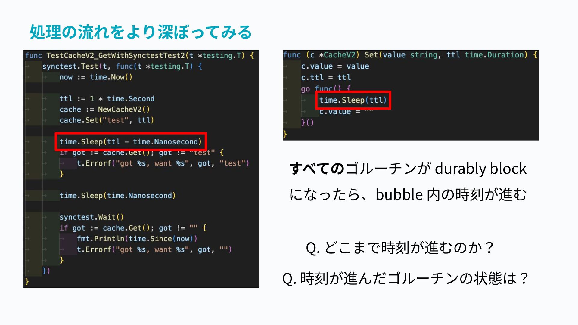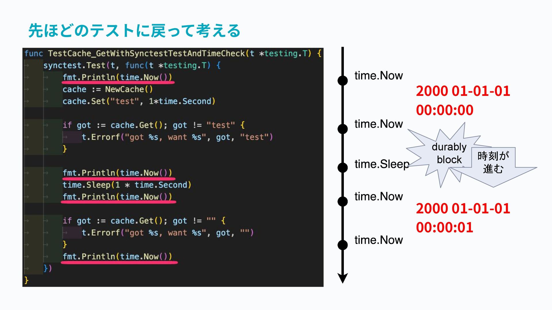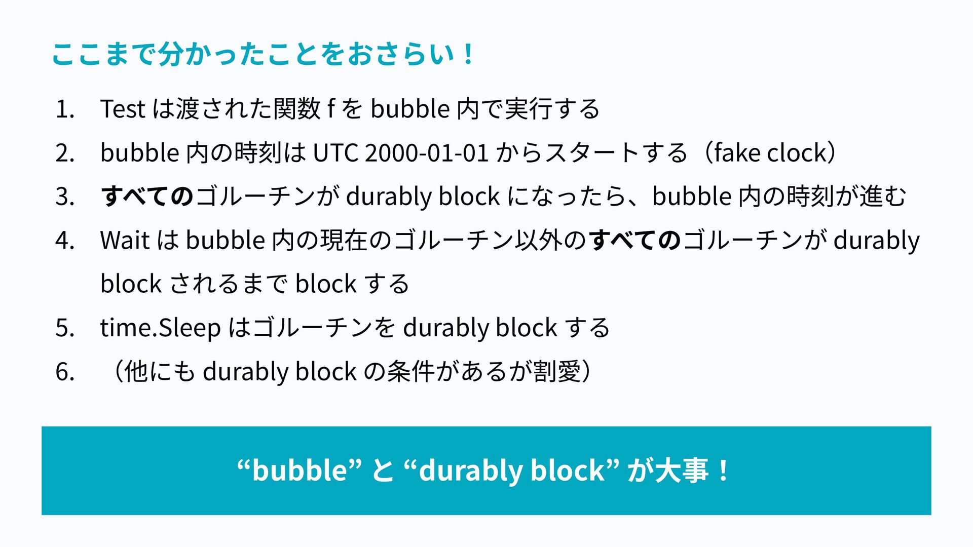 される場合に “durably block” になる 2. 以下の操作はゴルーチンを “durably block” する a. time.Sleep b. etc... 3. 以下の操作はゴルーチンを “durably block” しない a. sync.Mutex or sync.RWMutex b. etc...