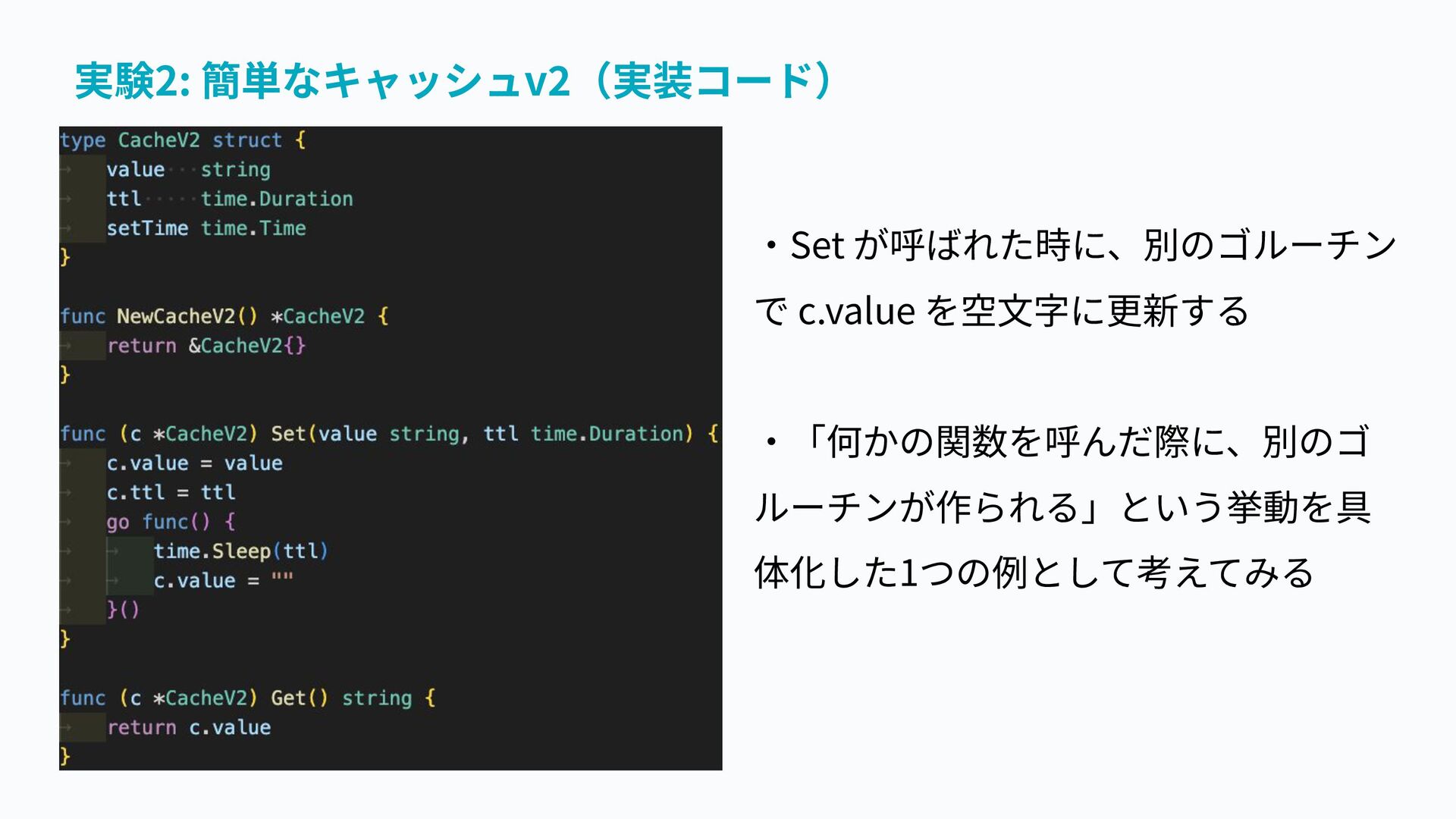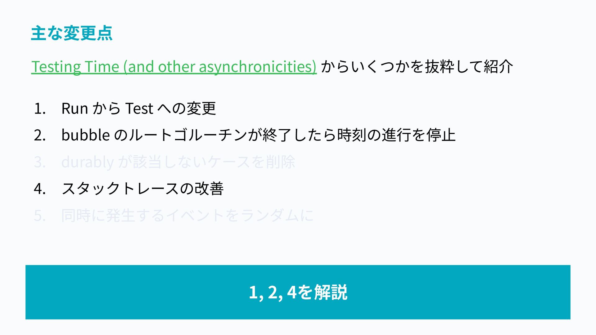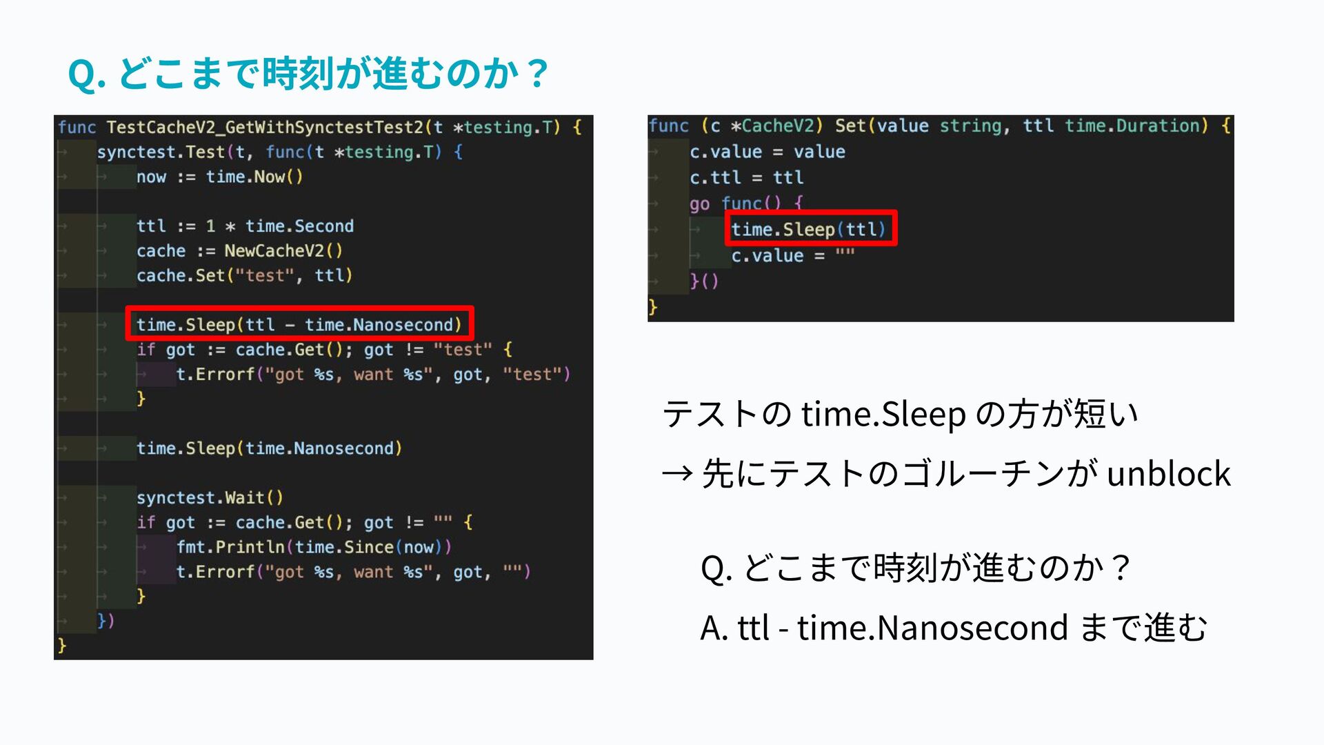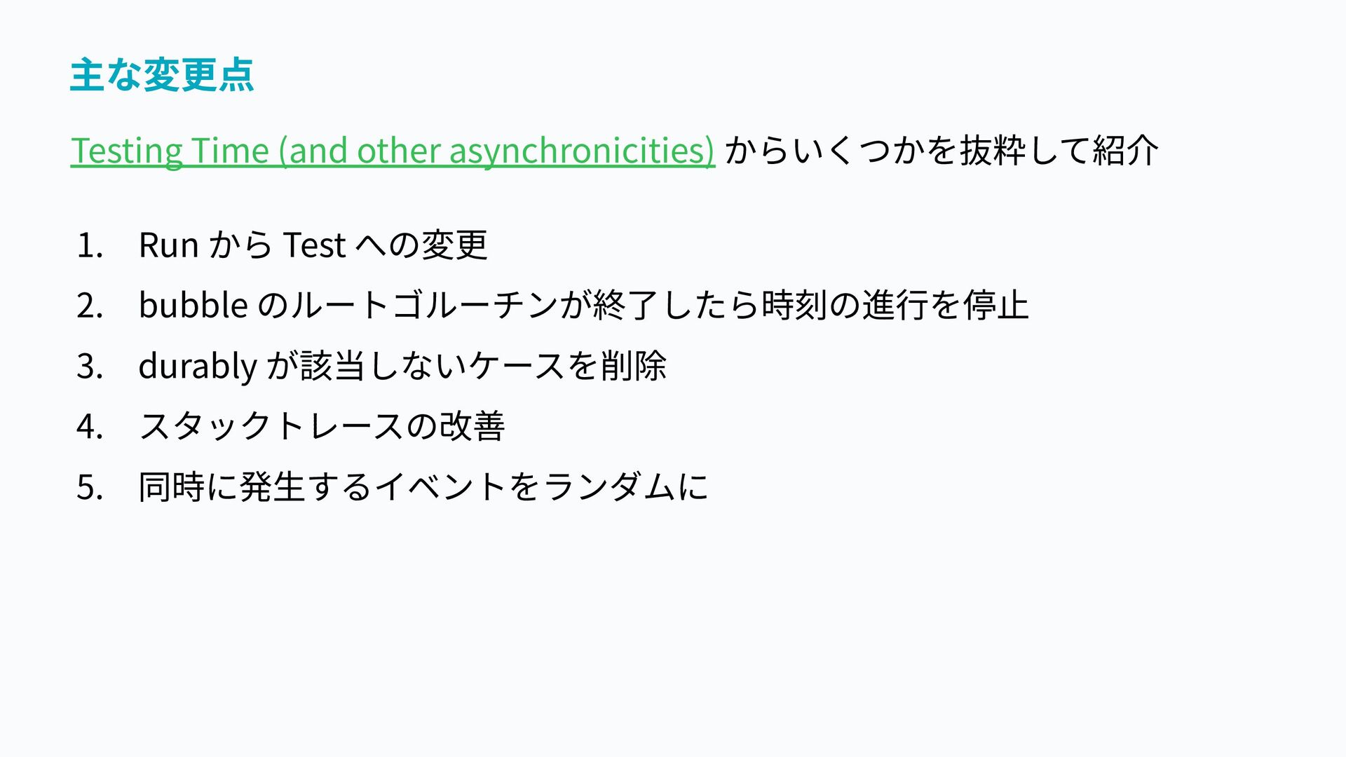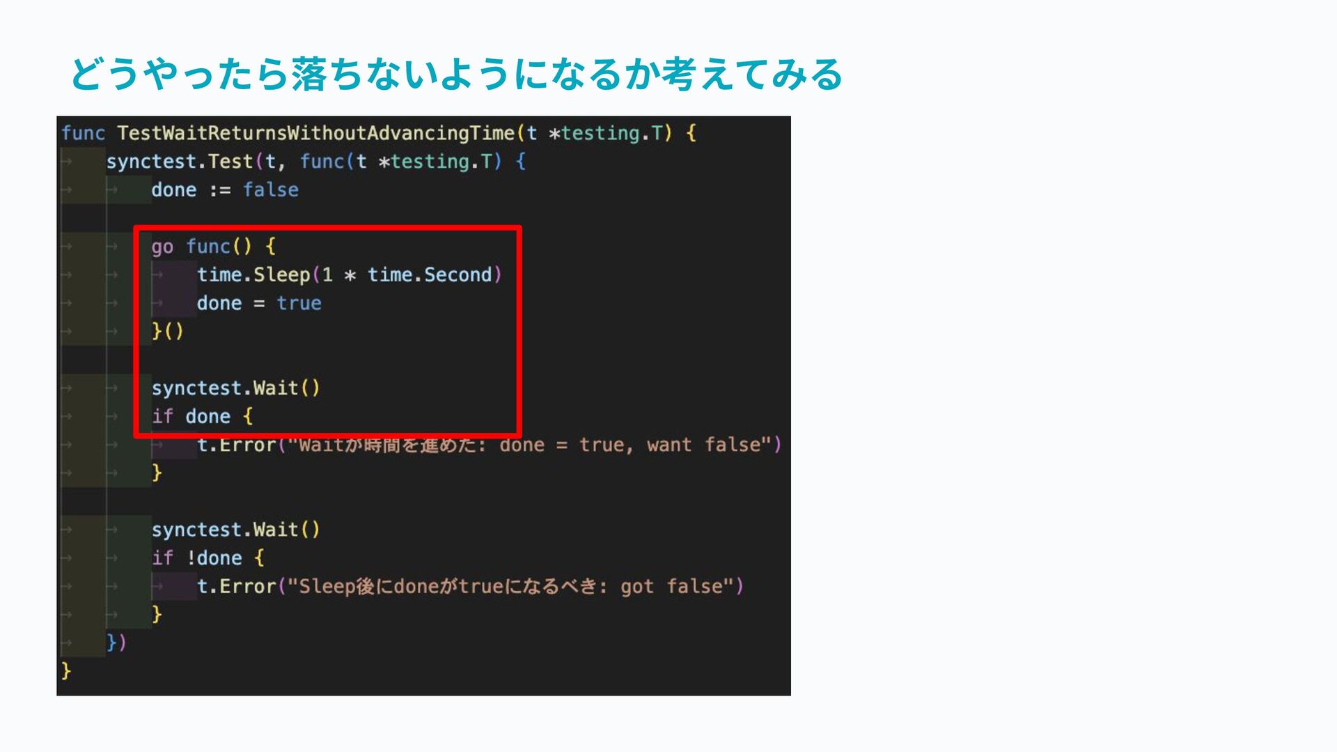 される場合に “durably block” になる 2. 以下の操作はゴルーチンを “durably block” する a. time.Sleep b. etc... 3. 以下の操作はゴルーチンを “durably block” しない a. sync.Mutex or sync.RWMutex b. etc...