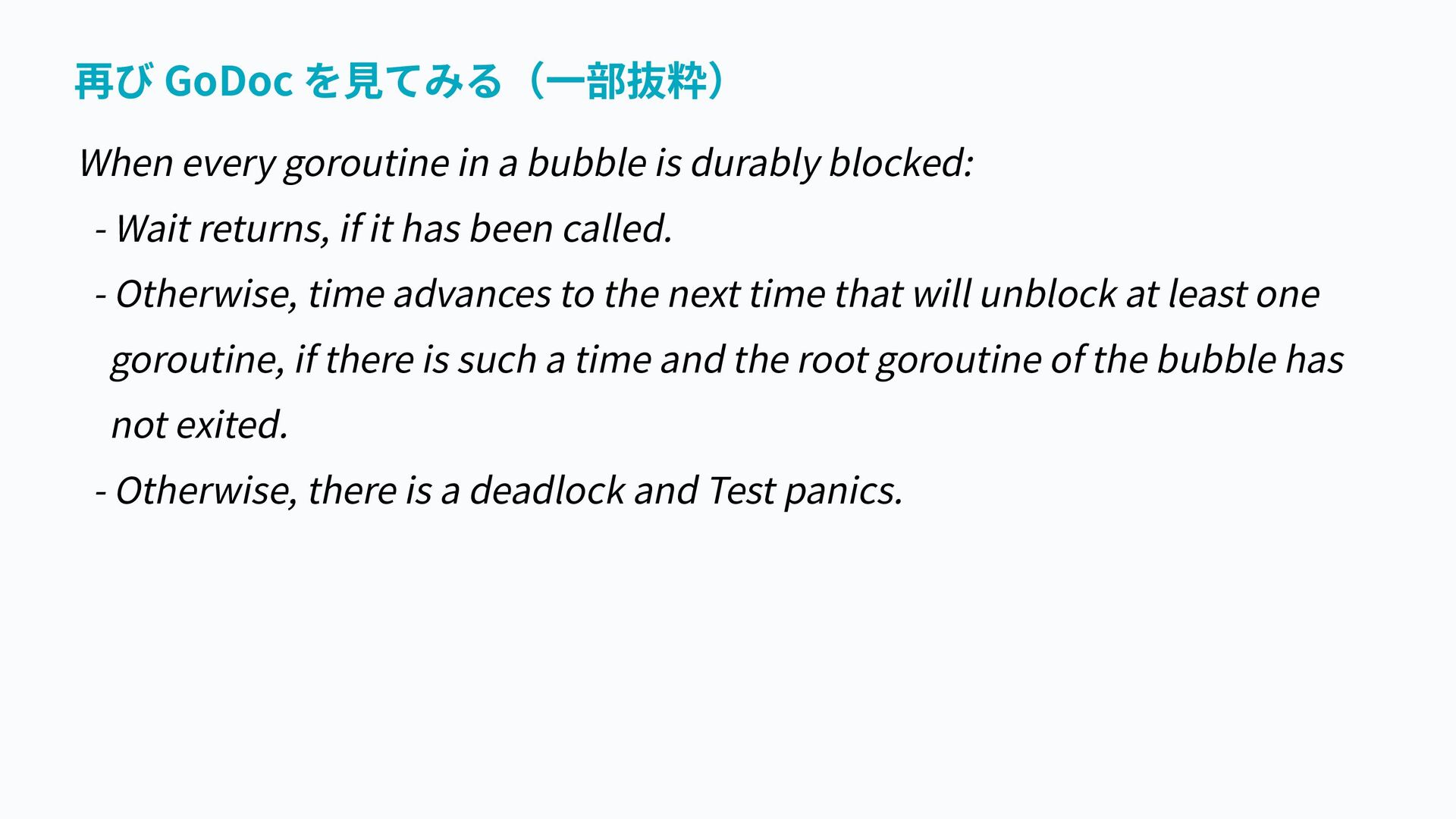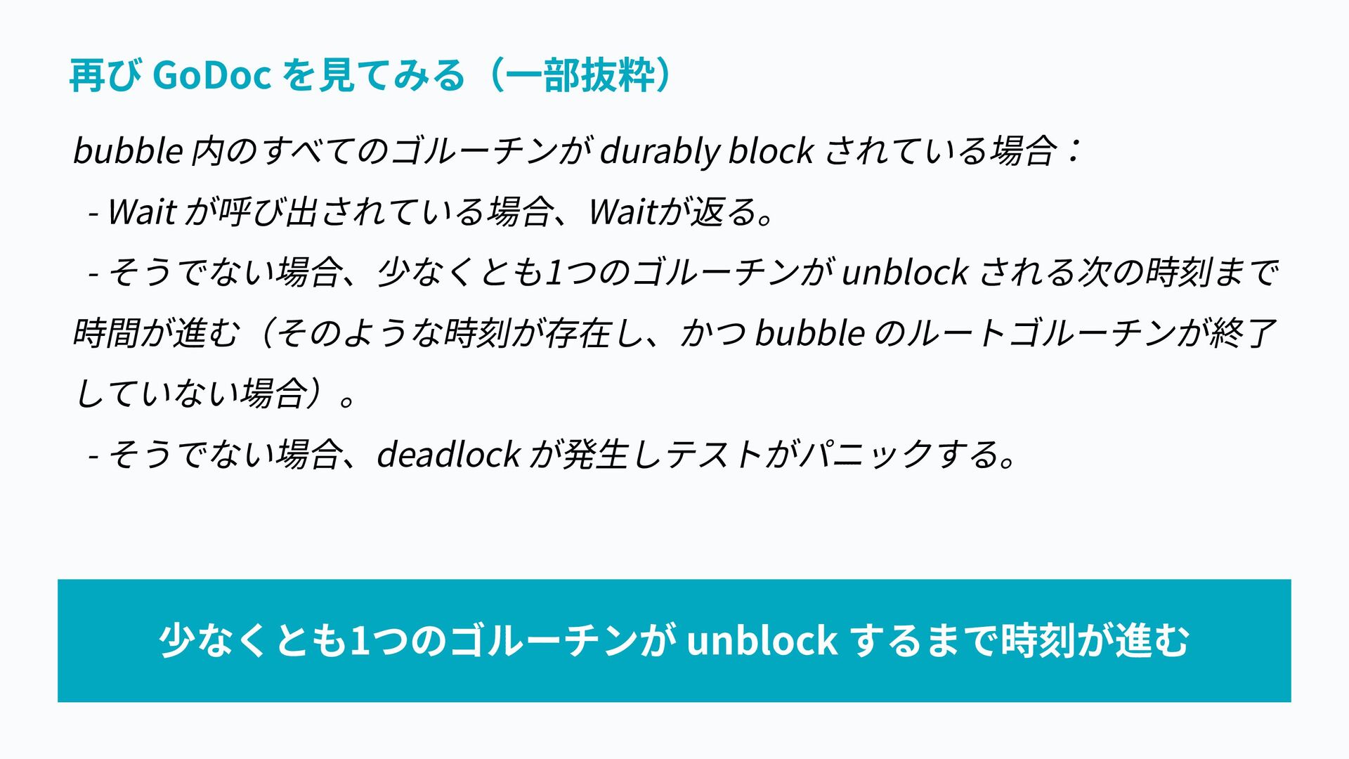 durably blocked: - Wait returns, if it has been called. - Otherwise, time advances to the next time that will unblock at least one goroutine, if there is such a time and the root goroutine of the bubble has not exited. - Otherwise, there is a deadlock and Test panics.