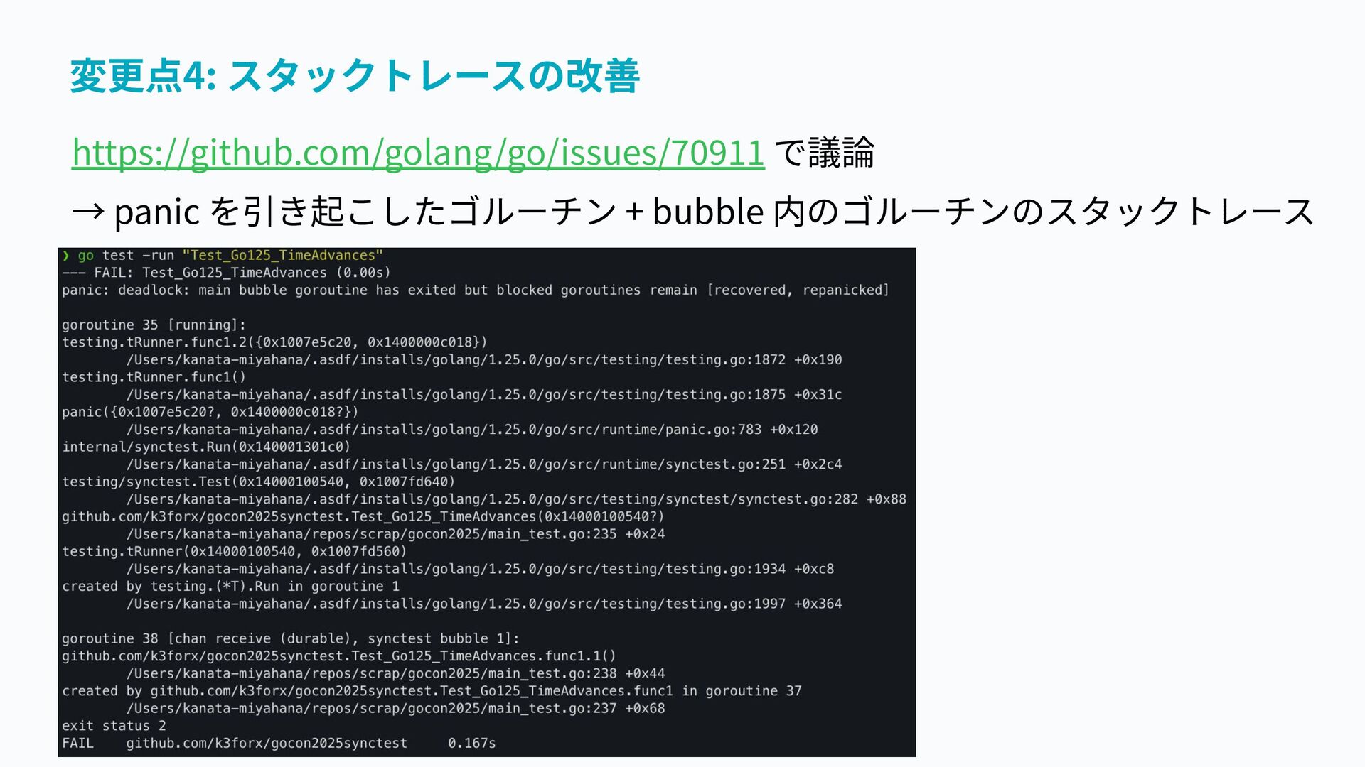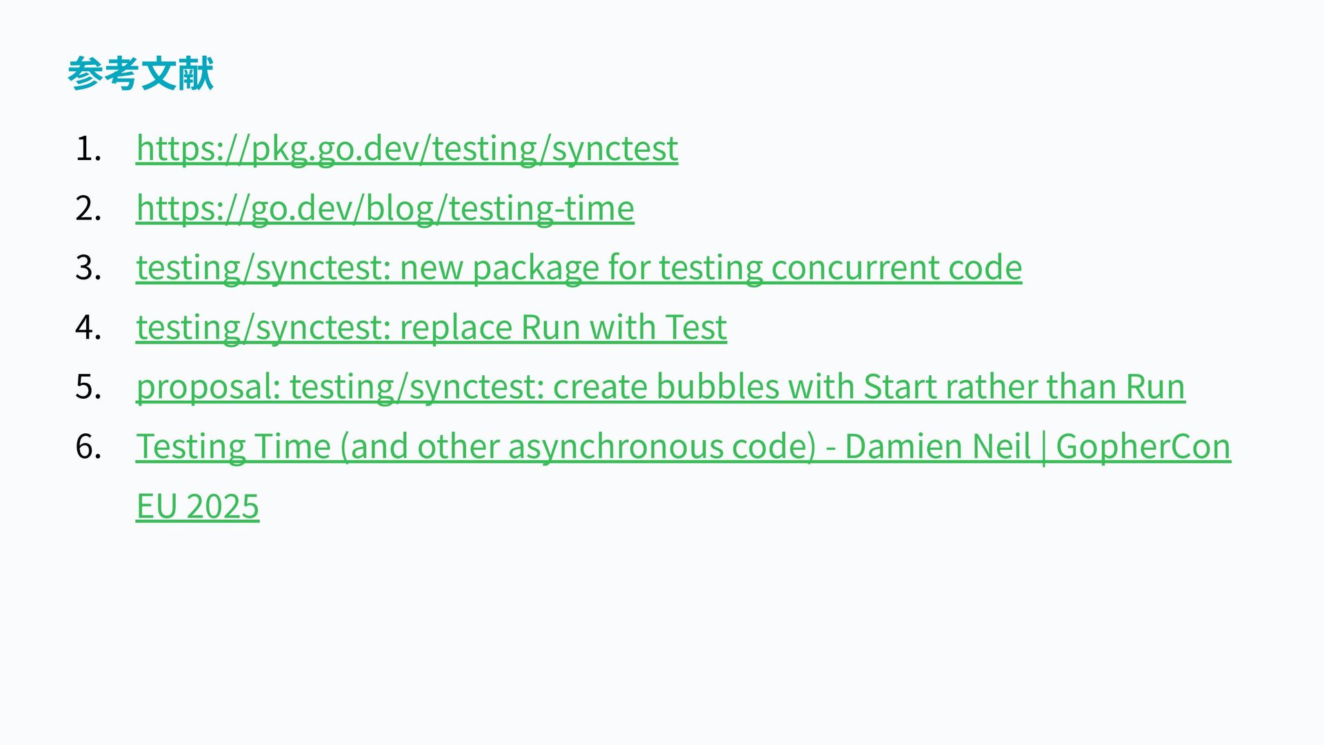 testing concurrent code 4. testing/synctest: replace Run with Test 5. proposal: testing/synctest: create bubbles with Start rather than Run 6. Testing Time (and other asynchronous code) - Damien Neil | GopherCon EU 2025