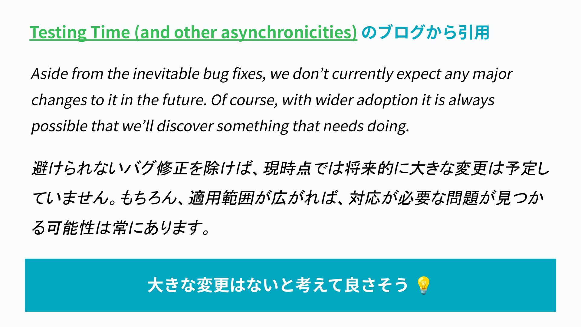 bug fixes, we don’t currently expect any major changes to it in the future. Of course, with wider adoption it is always possible that we’ll discover something that needs doing. 避けられないバグ修正を除けば、現時点では将来的に大きな変更は予定し ていません。もちろん、適用範囲が広がれば、対応が必要な問題が見つか る可能性は常にあります。 ⼤きな変更はないと考えて良さそう 💡
