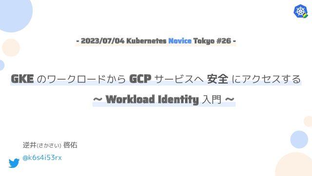 としてデプロイ(勝手に) • 関連付けたい K8s SA と IAM SA の間に IAM Policy Binding を追加 $ gcloud iam service-accounts add-iam-policy-binding <IAM SA>@<PJID>.iam.gserviceaccount.com \ --role roles/iam.workloadIdentityUser \ --member "serviceAccount:<PJID>.svc.id.goog[NAMESPACE/<K8s SA>]" • K8s SA の annotation に関連付けたい IAM SA 以下を追加 iam.gke.io/gcp-service-account:<IAM SA>@<PJID>.iam.gserviceaccount.com - 2023/07/04 Kubernetes Novice Tokyo #26 - Workload Identity is 何? IAM 内の 関連付け K8s 内の 関連付け