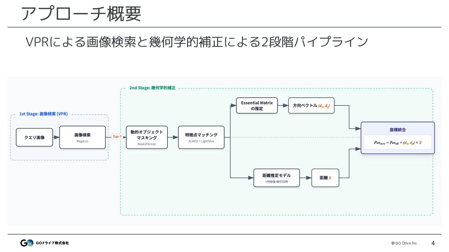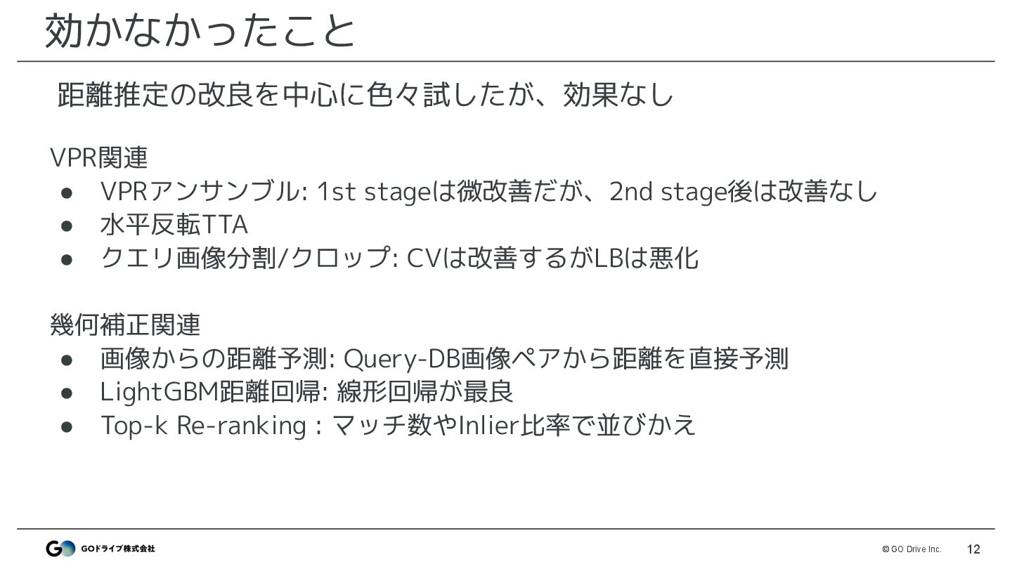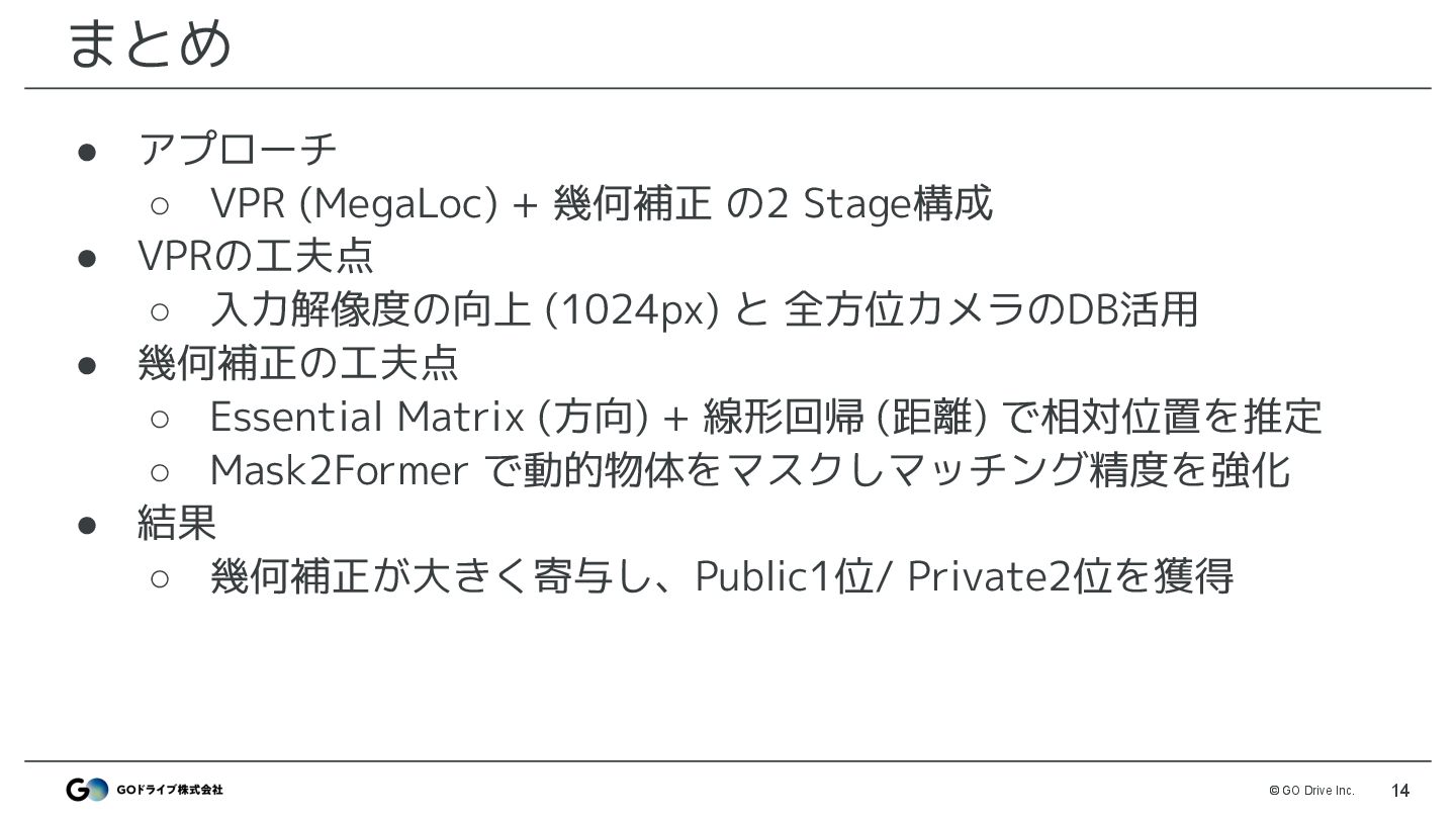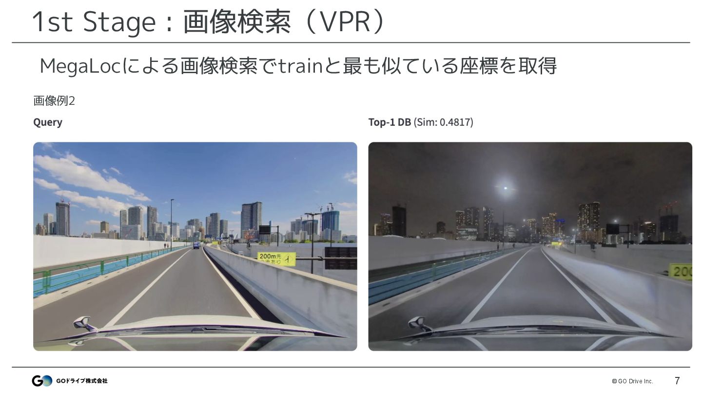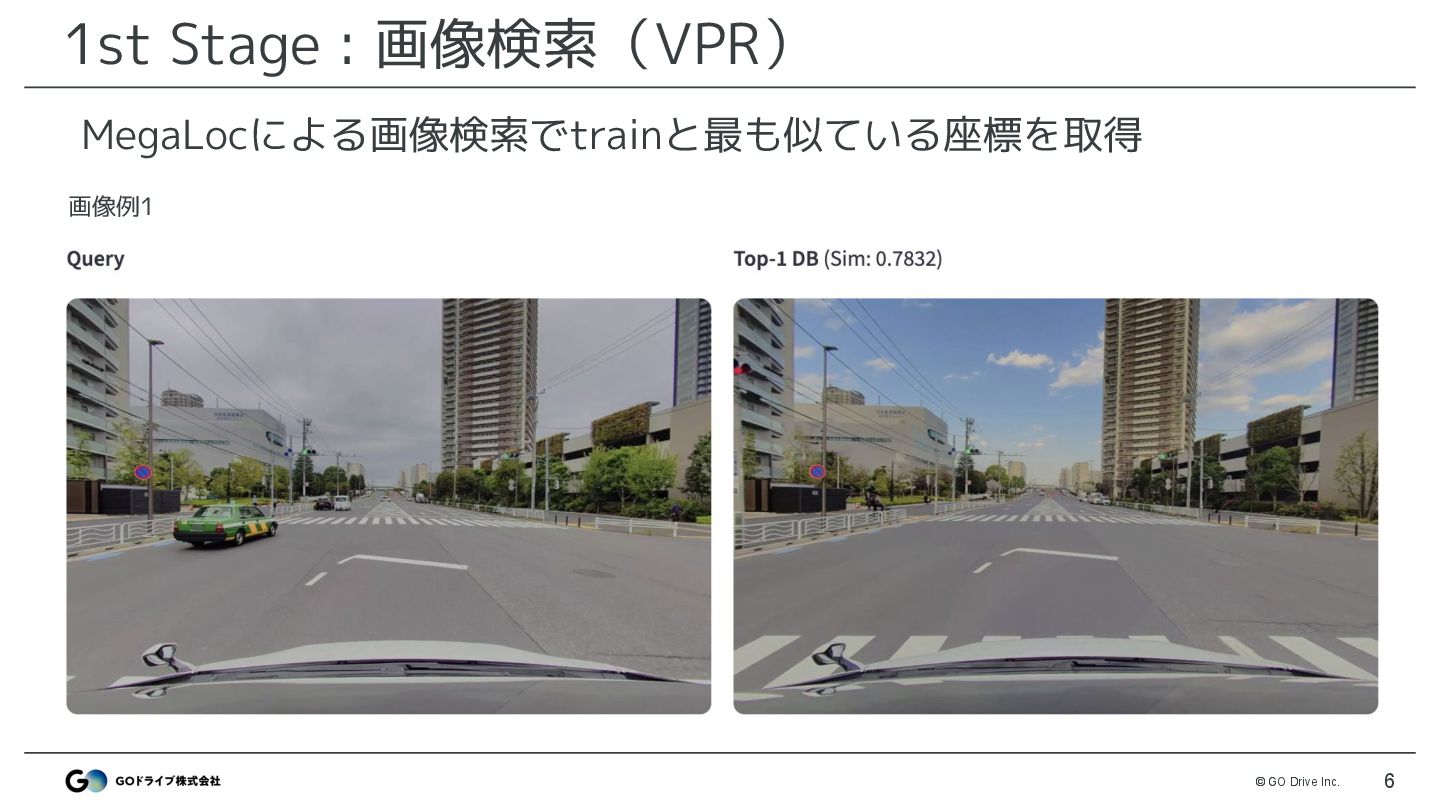 VPRモデルでtrain画像と最も類似した画像を検索 • モデル: MegaLoc ◦ モデル以外はDiscussionで公開したベースライン(※)と同様 • 改善ポイント ◦ 解像度 : 512 → 1024で改善 ◦ DBは3カメラ登録 : FRONTのみではなくLEFT,RIGHTも登録 ※ https://www.guruguru.science/competitions/31/discussions/53f38366-e4cf-4141-8048-5e947031e8bb/ MegaLocによる画像検索でtrainと最も似ている座標を取得