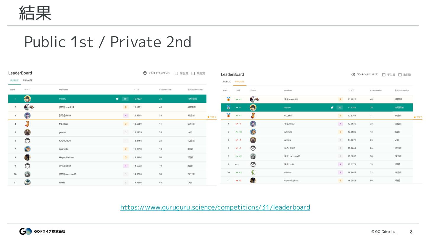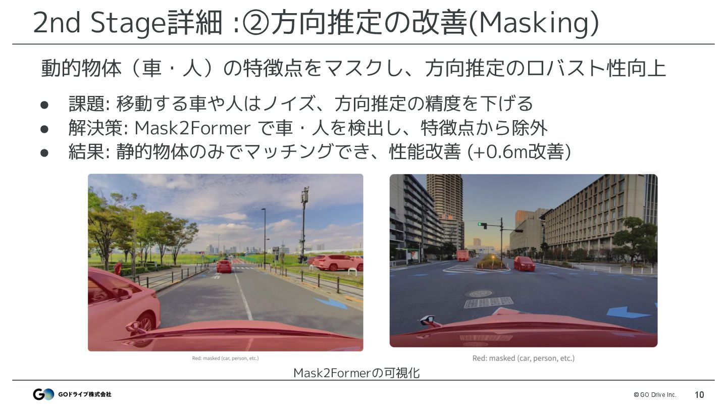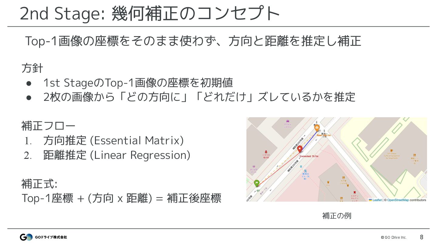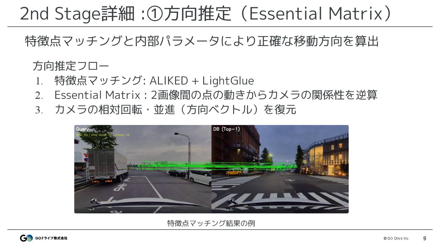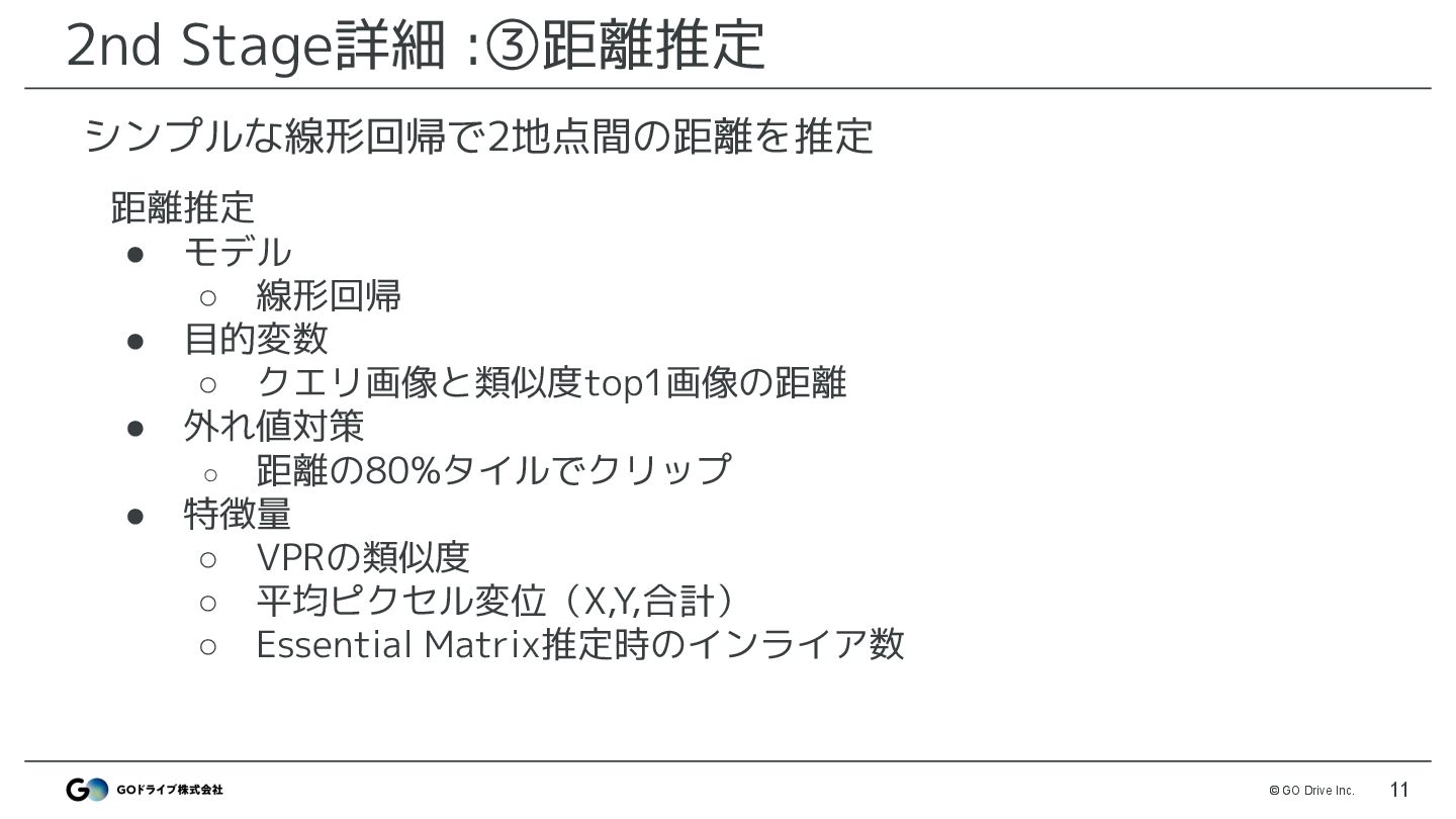 VPRモデルでtrain画像と最も類似した画像を検索 • モデル: MegaLoc ◦ モデル以外はDiscussionで公開したベースライン(※)と同様 • 改善ポイント ◦ 解像度 : 512 → 1024で改善 ◦ DBは3カメラ登録 : FRONTのみではなくLEFT,RIGHTも登録 ※ https://www.guruguru.science/competitions/31/discussions/53f38366-e4cf-4141-8048-5e947031e8bb/ MegaLocによる画像検索でtrainと最も似ている座標を取得