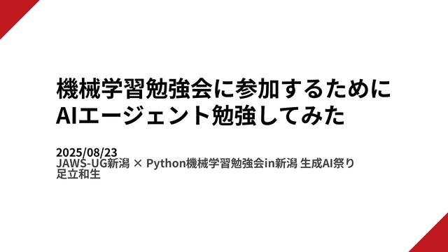 AIエージェント勉強してみた 2025/08/23 JAWS-UG新潟 × Python機械学習勉強会in新潟 ⽣成AI祭り ⾜⽴和⽣