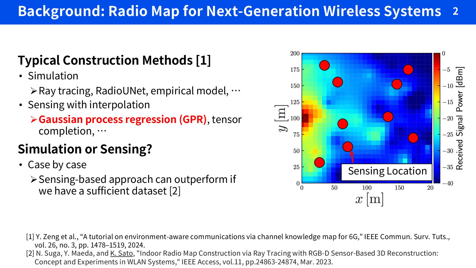 Methods [1] • Simulation ØRay tracing, RadioUNet, empirical model, … • Sensing with interpolation ØGaussian process regression (GPR), tensor completion, … Simulation or Sensing? • Case by case ØSensing-based approach can outperform if we have a sufficient dataset [2] [1] Y. Zeng et al., “A tutorial on environment-aware communications via channel knowledge map for 6G,” IEEE Commun. Surv. Tuts., vol. 26, no. 3, pp. 1478–1519, 2024. [2] N. Suga, Y. Maeda, and K. Sato, "Indoor Radio Map Construction via Ray Tracing with RGB-D Sensor-Based 3D Reconstruction: Concept and Experiments in WLAN Systems," IEEE Access, vol.11, pp.24863-24874, Mar. 2023. Sensing Location