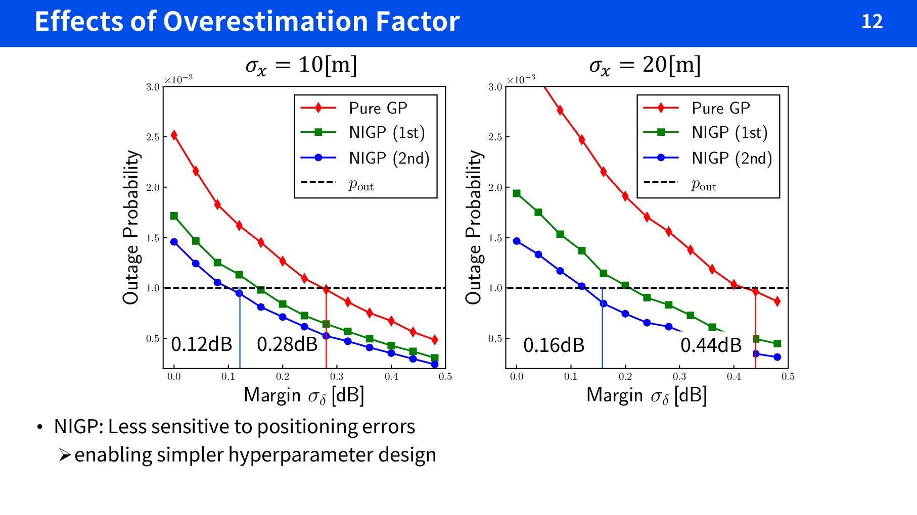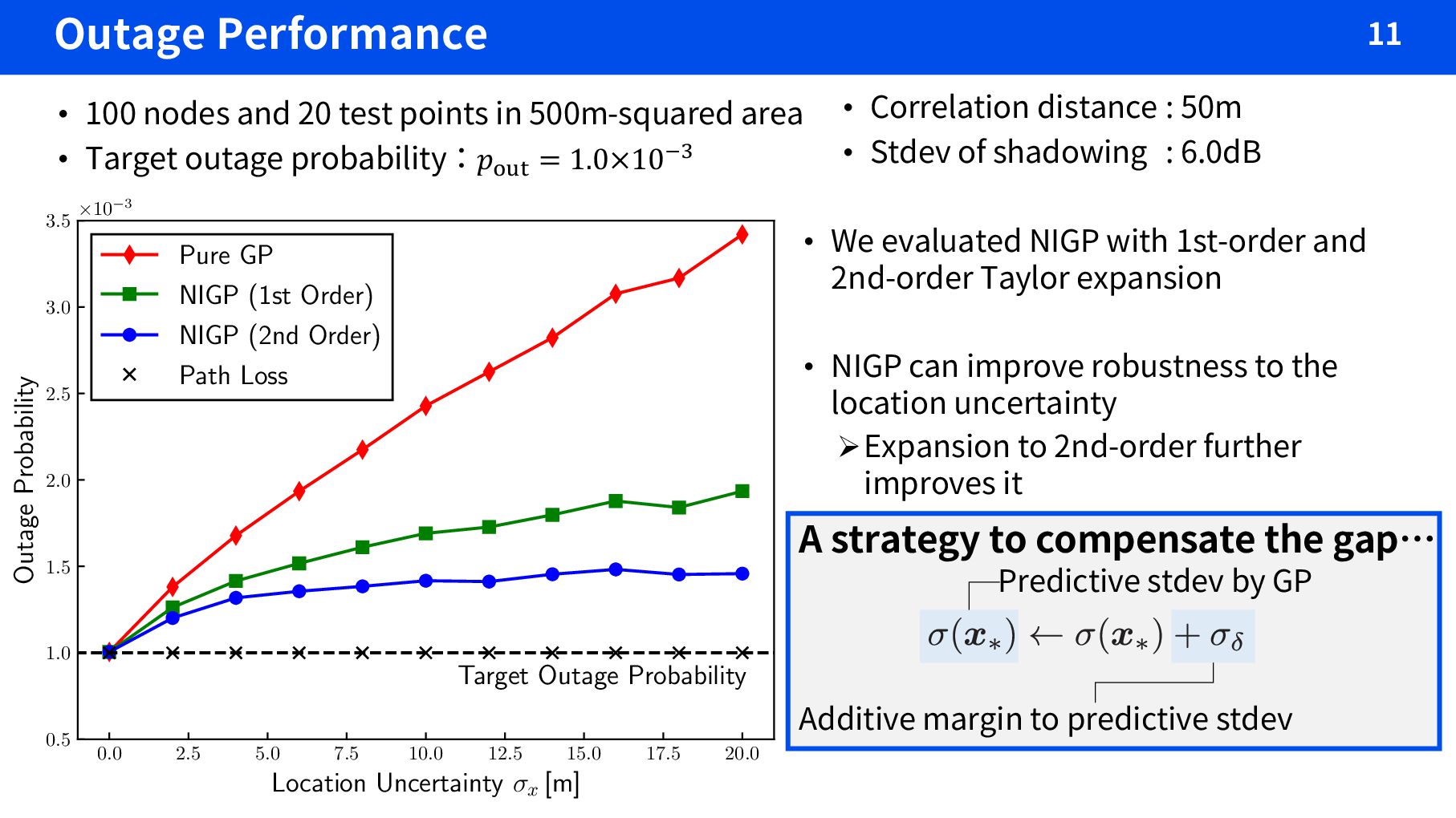 2nd-order Taylor expansion • NIGP can improve robustness to the location uncertainty ØExpansion to 2nd-order further improves it 0.0 2.5 5.0 7.5 10.0 12.5 15.0 17.5 20.0 Location Uncertainty æx [m] 0.5 1.0 1.5 2.0 2.5 3.0 3.5 Outage Probability £10°3 Target Outage Probability Pure GP NIGP (1st Order) NIGP (2nd Order) Path Loss A strategy to compensate the gap… Additive margin to predictive stdev Predictive stdev by GP • 100 nodes and 20 test points in 500m-squared area • Target outage probability:𝑝#$% = 1.0×10&' • Correlation distance : 50m • Stdev of shadowing : 6.0dB