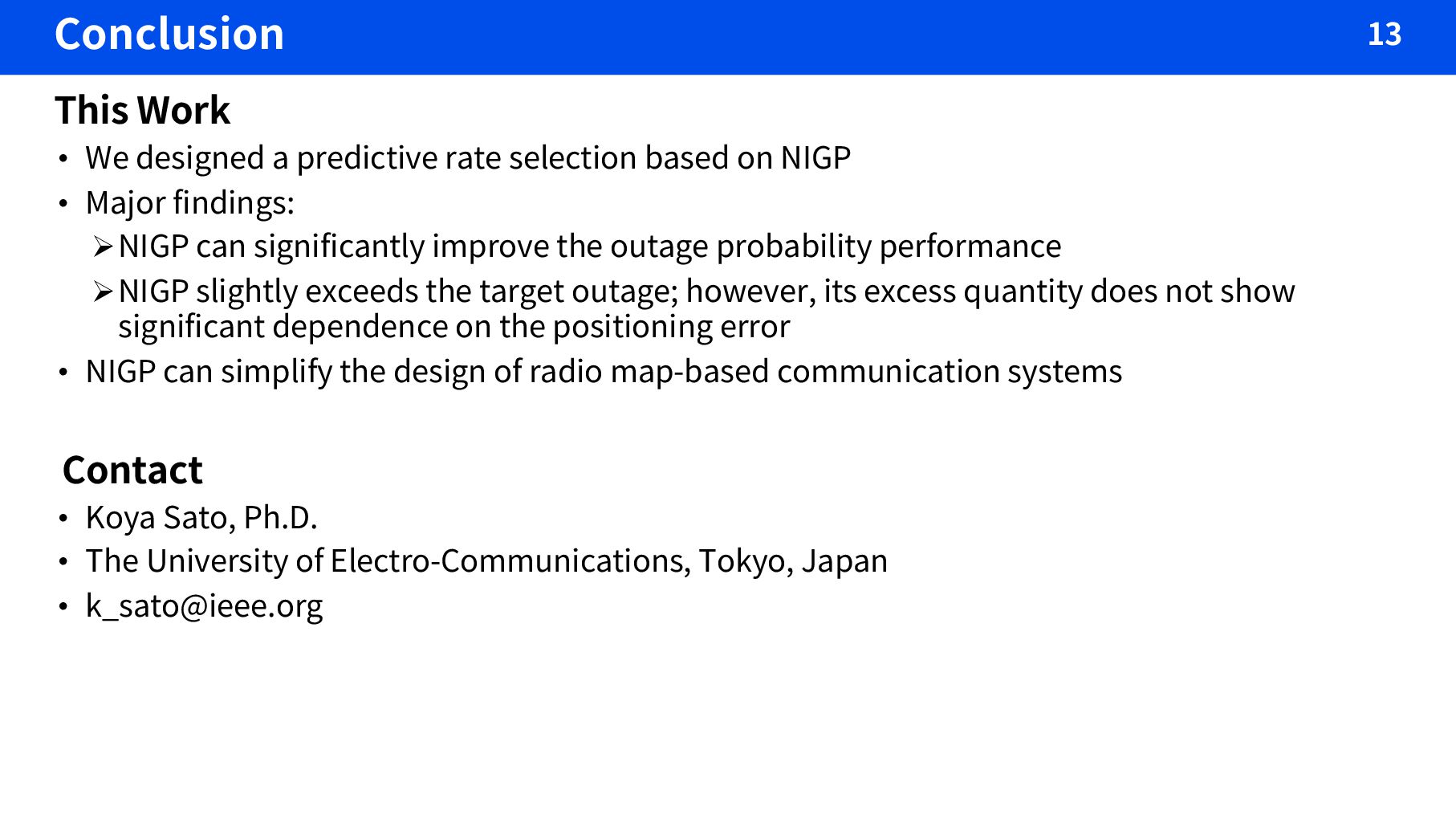 selection based on NIGP • Major findings: ØNIGP can significantly improve the outage probability performance ØNIGP slightly exceeds the target outage; however, its excess quantity does not show significant dependence on the positioning error • NIGP can simplify the design of radio map-based communication systems Contact • Koya Sato, Ph.D. • The University of Electro-Communications, Tokyo, Japan • [email protected]